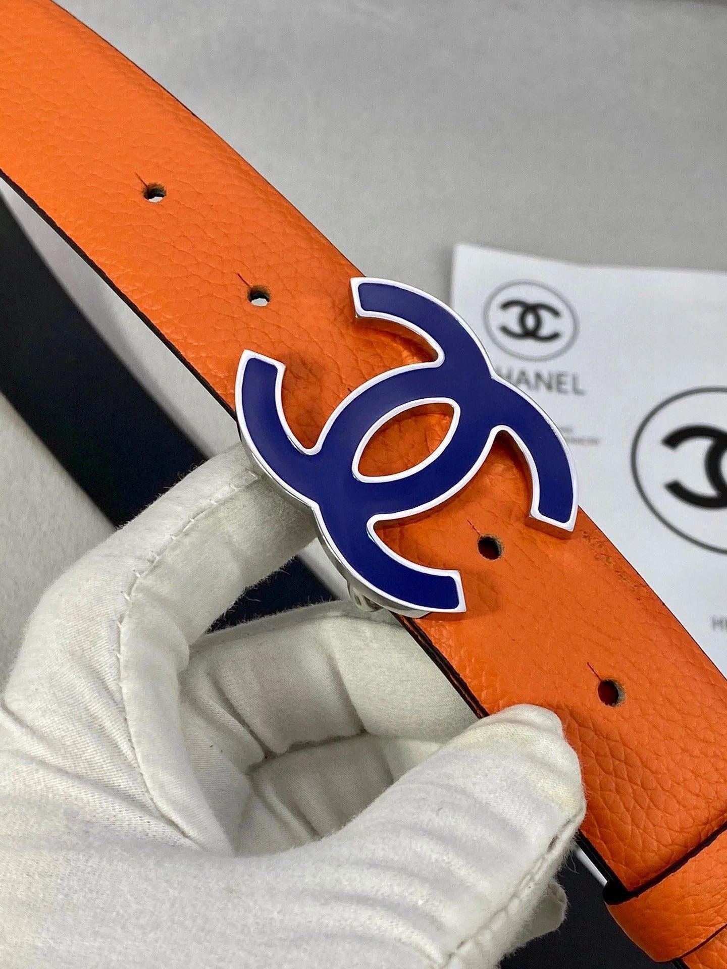 CC 30MM BELT IN FIRE ORANGE GRAINED CALFSKIN WITH NAVY BLUE METAL LOGO