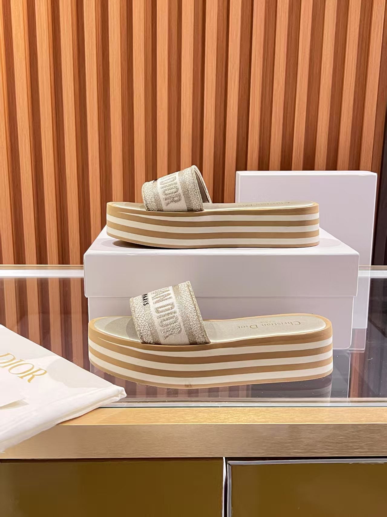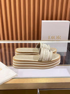 CD Dway Platform Slide Beige Brown Fabric with Lambskin 242442