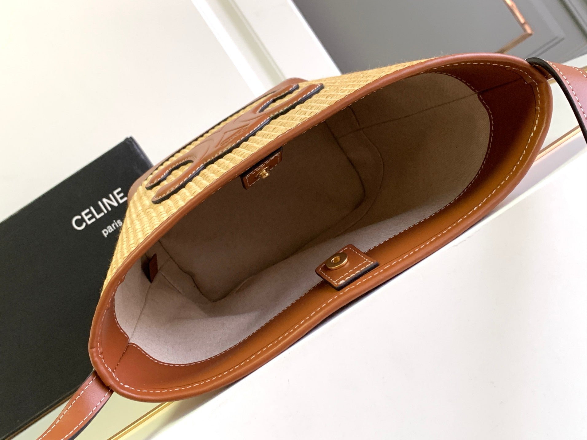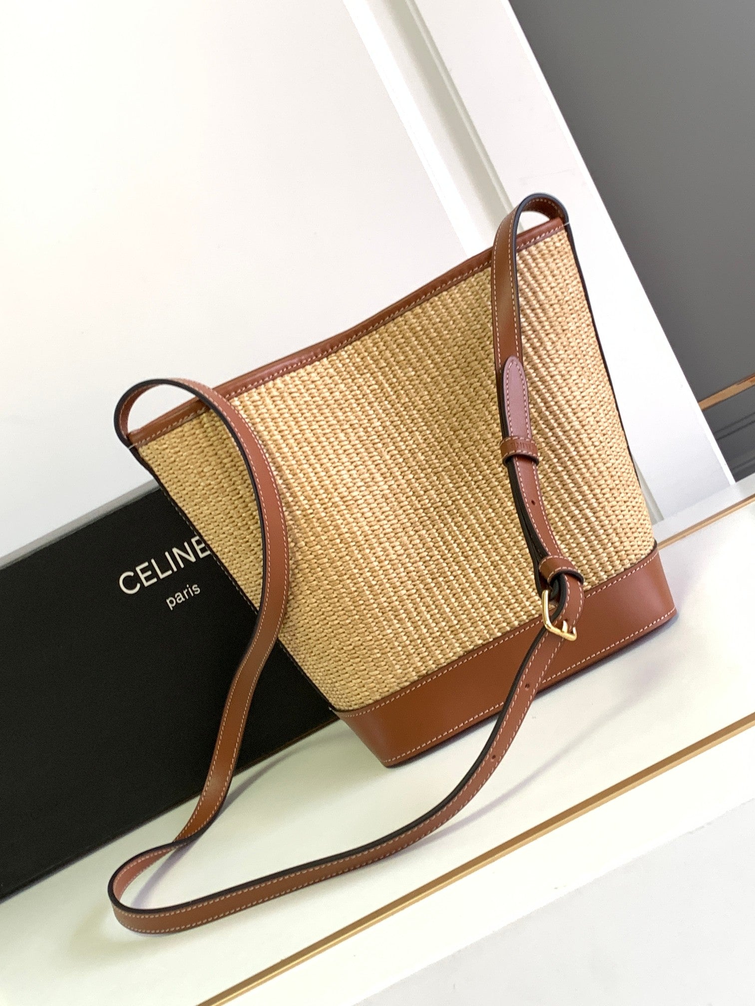 SMALL BUCKET CUIR TRIOMPHE 22CM IN STRIPED TEXTILE AND TAN CALFSKIN