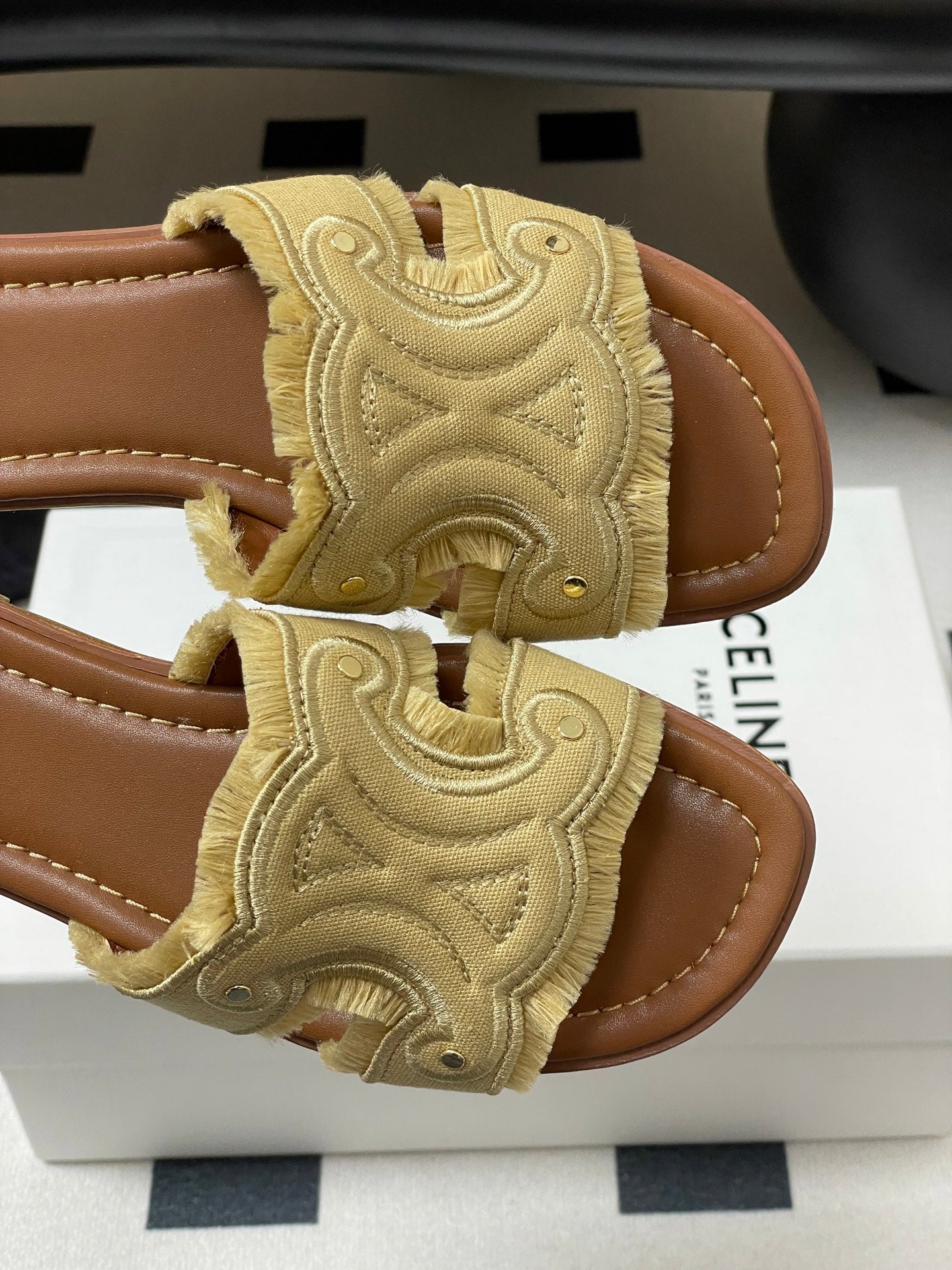 Celine 25 Straw Rivet Birkenstock Slippers Beige Brown Raffia woven Sheepskin