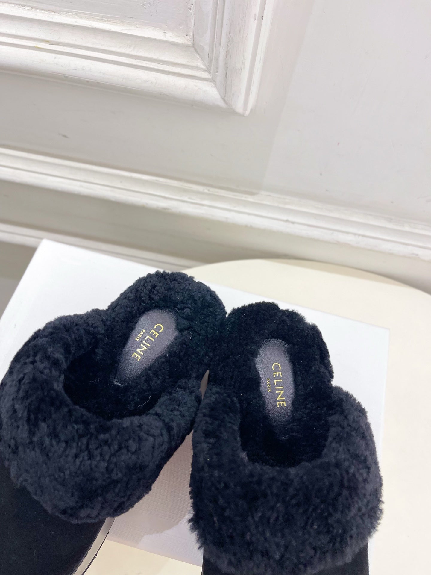Celine 26 Flat Mule Slippers Black Sheepskin 621528