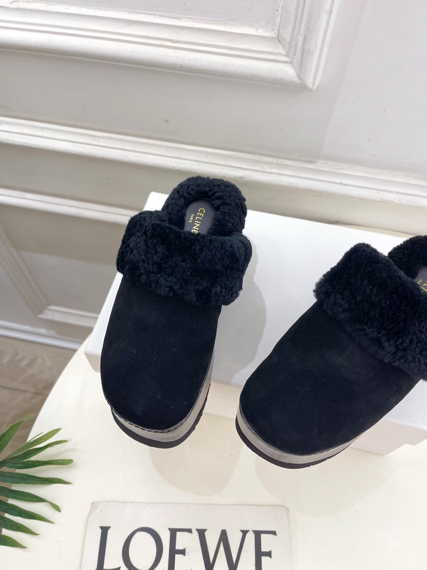 Celine Pitea Clogs Black Suede Calfskin Shearling 610962