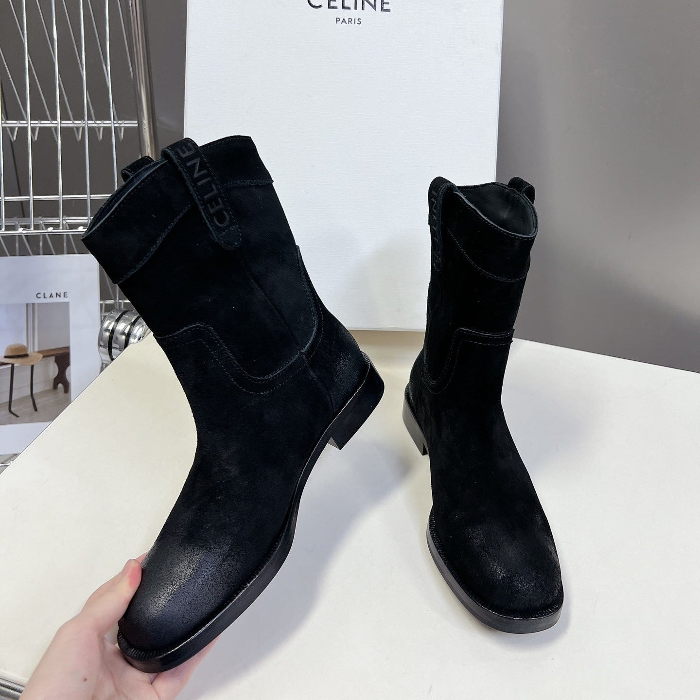CELINE 25 Mid Calf Cowboy Boots Black Suede 434426