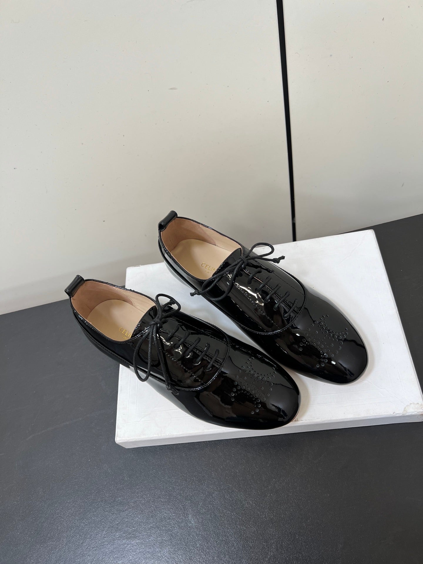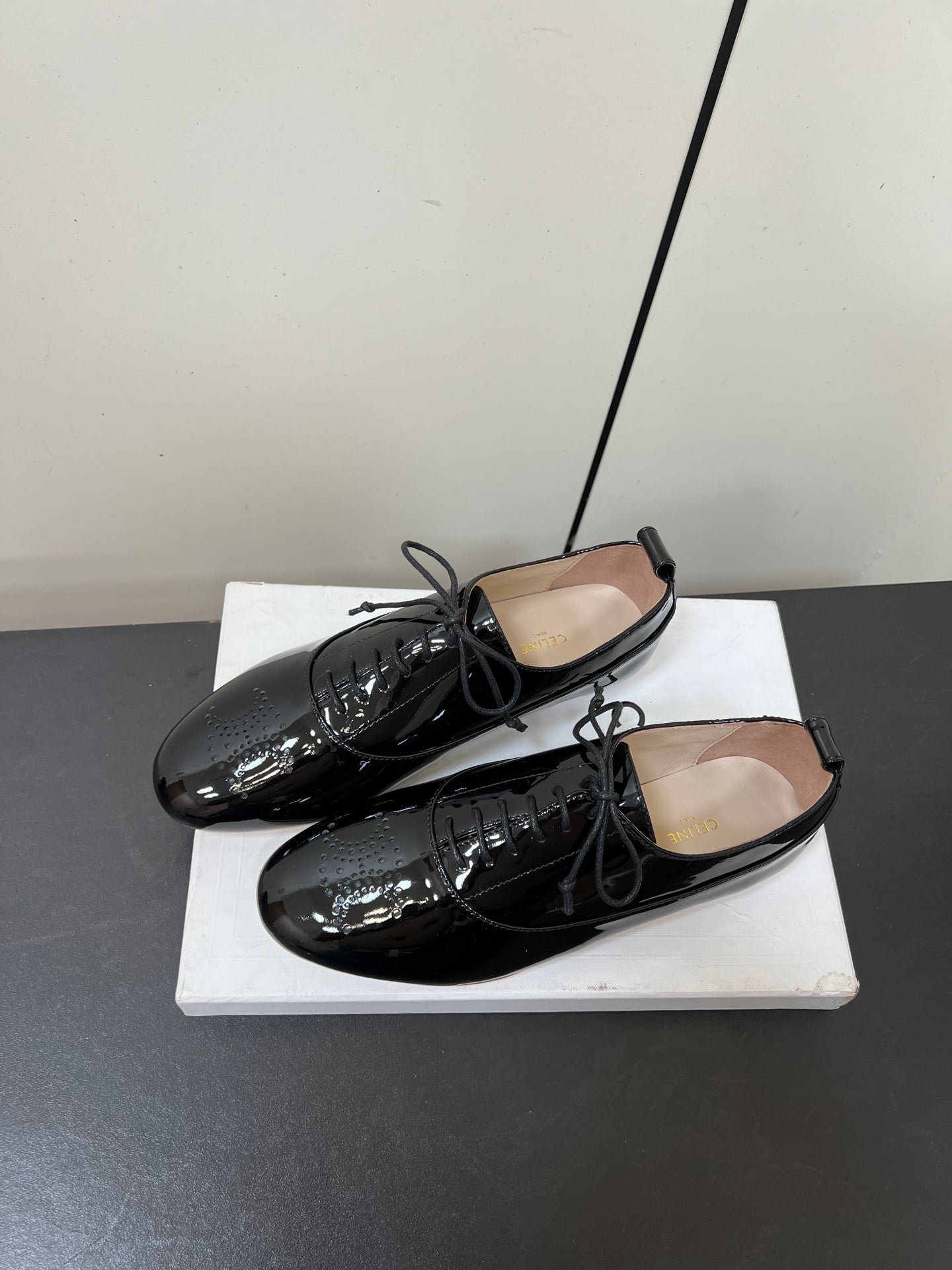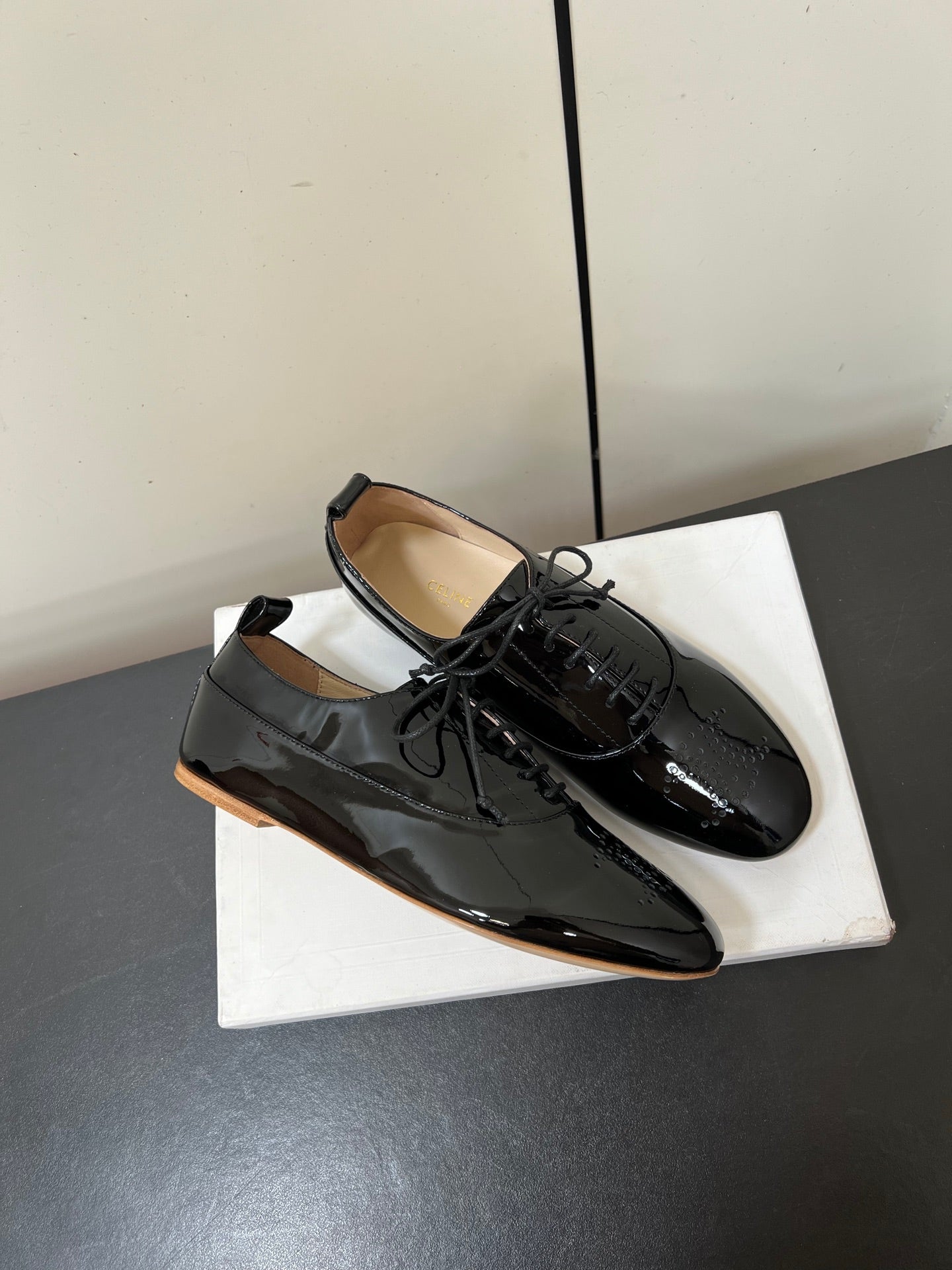 Celine 25 Lise Perforated Triomphe Richelieu Shoe Black Patent Leather 619644