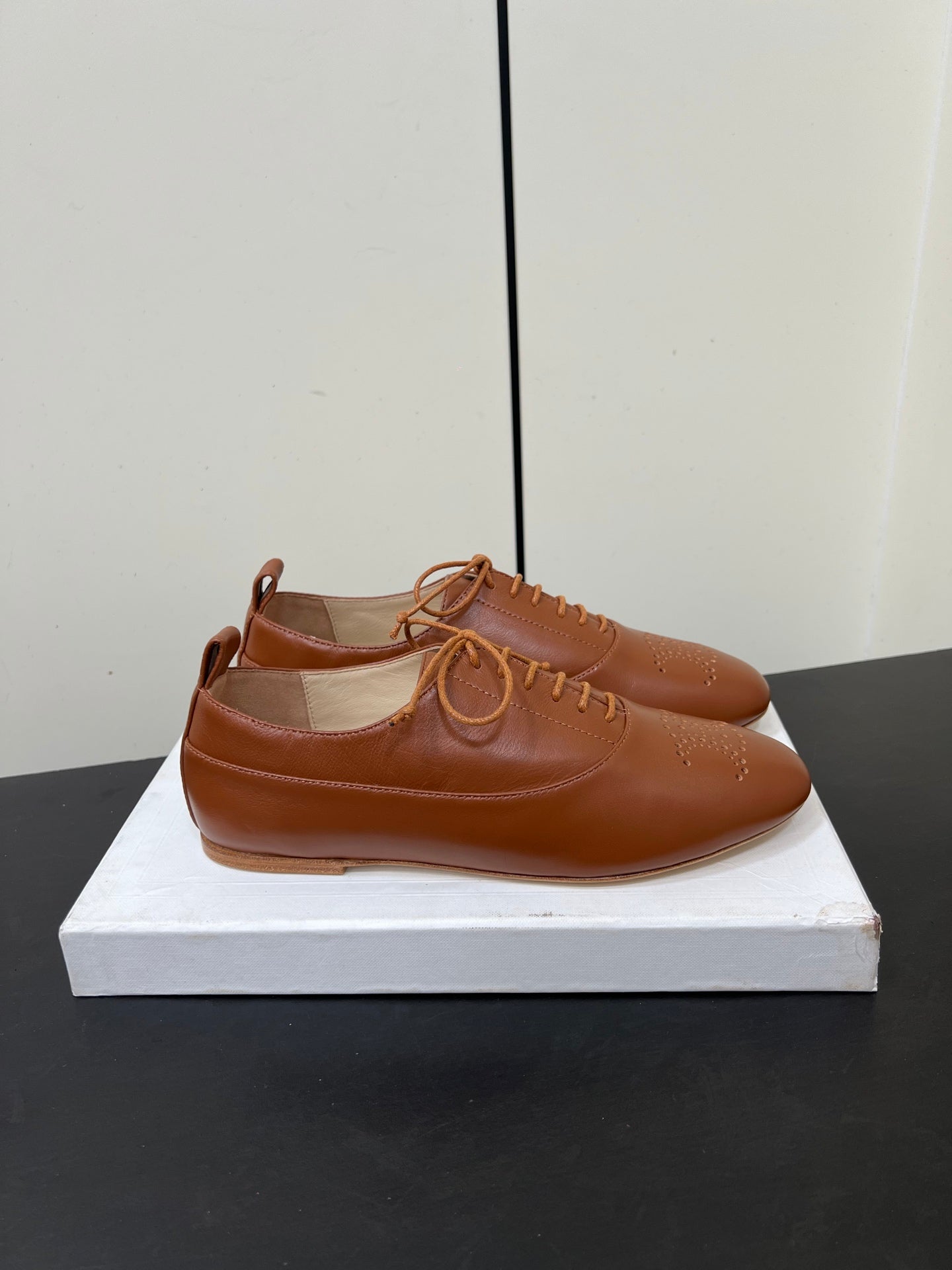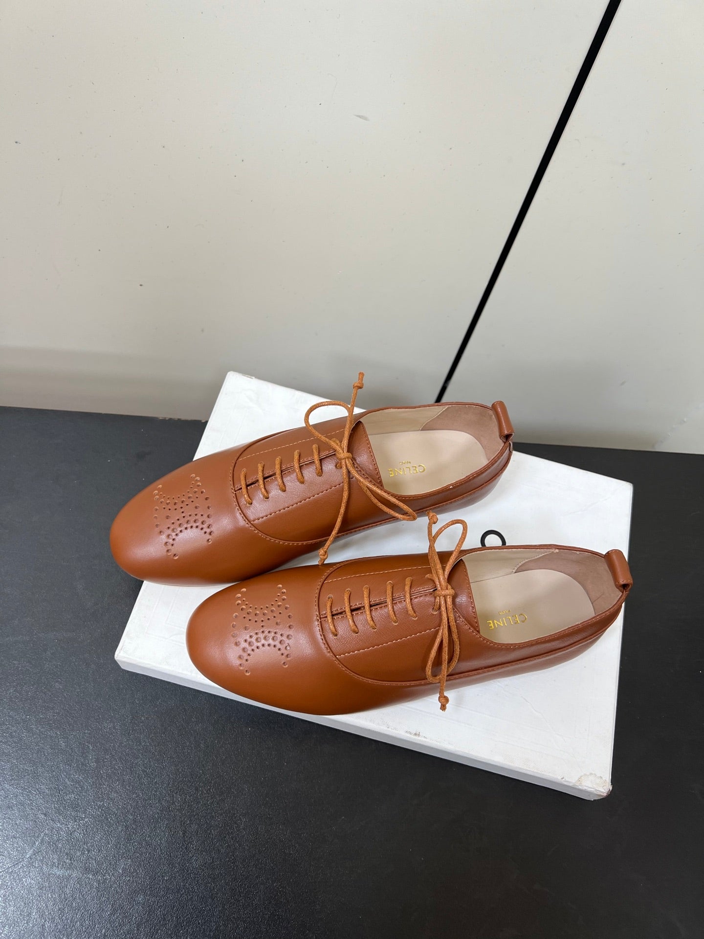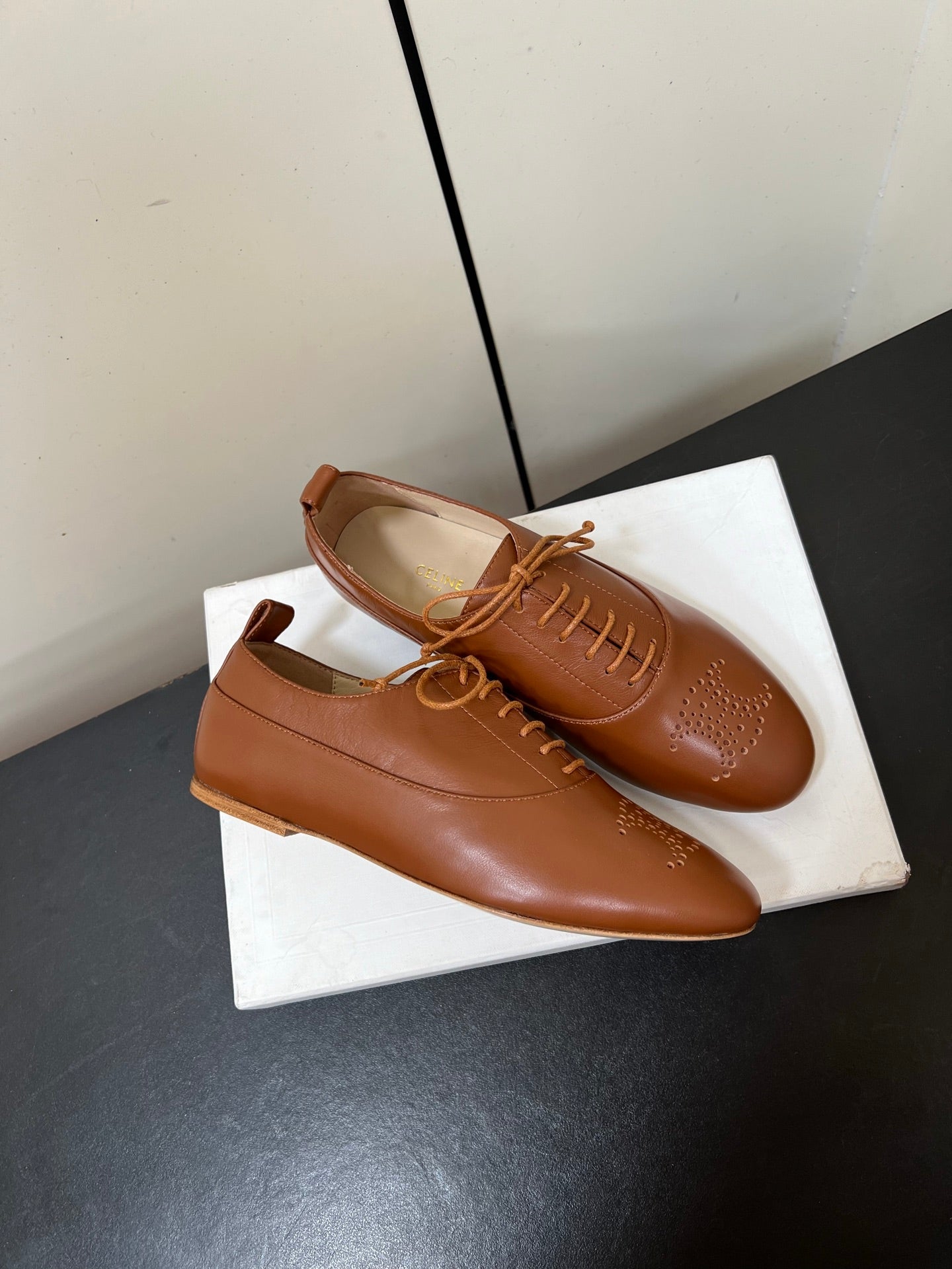 Celine 25 Lise Perforated Triomphe Richelieu Shoe Brown Lambskin 619646