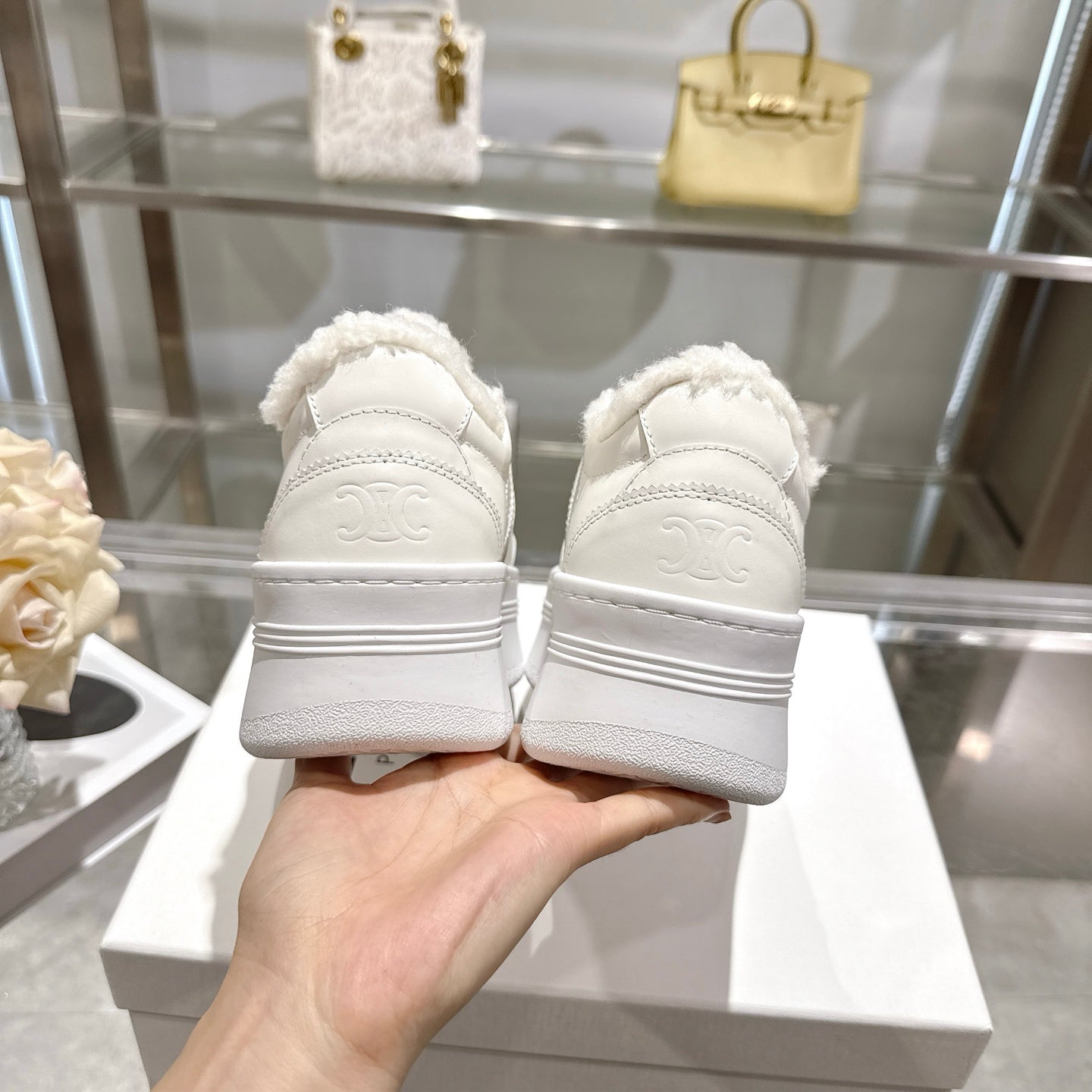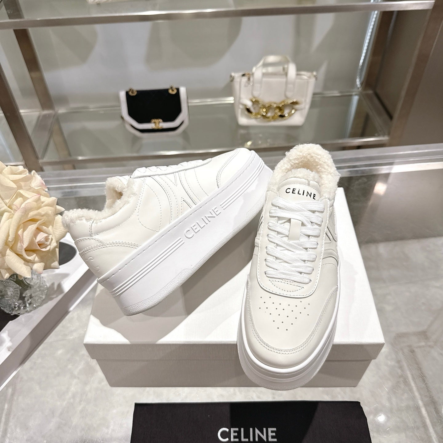Celine Block Triomphe Leather Wedge Sneakers 50mm White Calfskin Fur