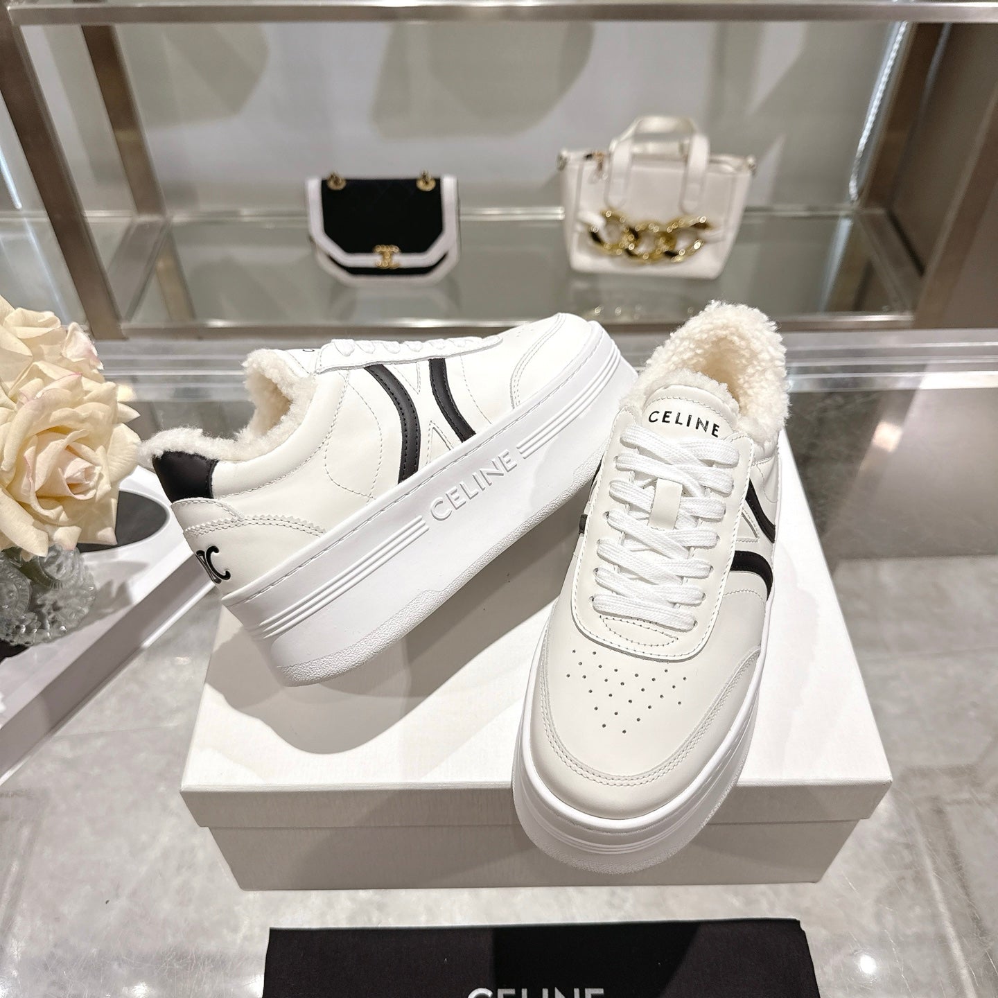 Celine Block Triomphe Leather Wedge Sneakers 50mm Black White Calfskin Fur