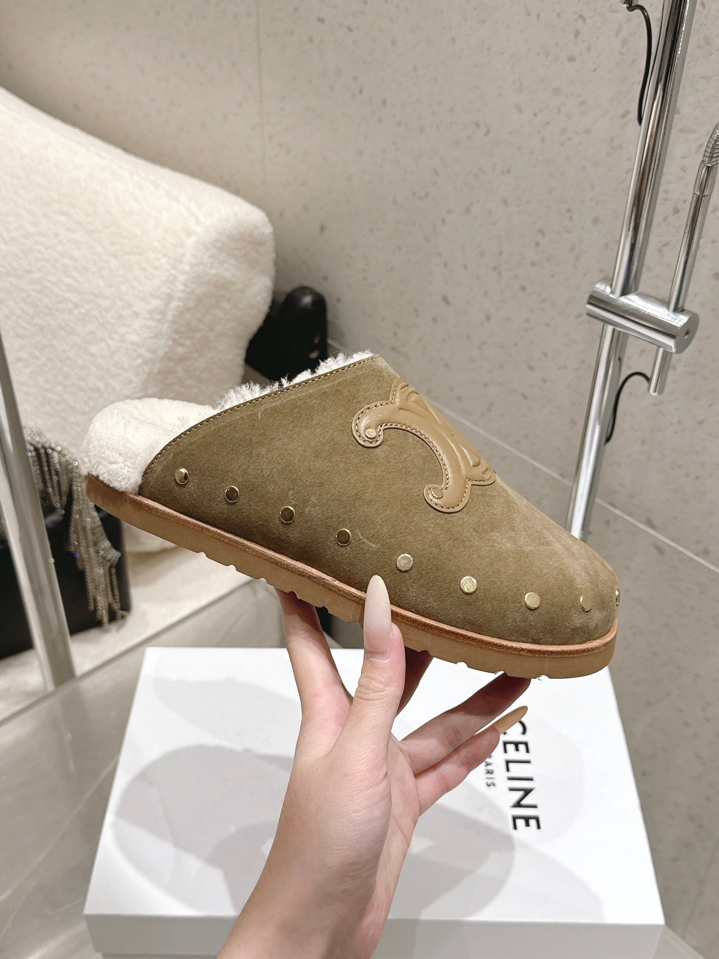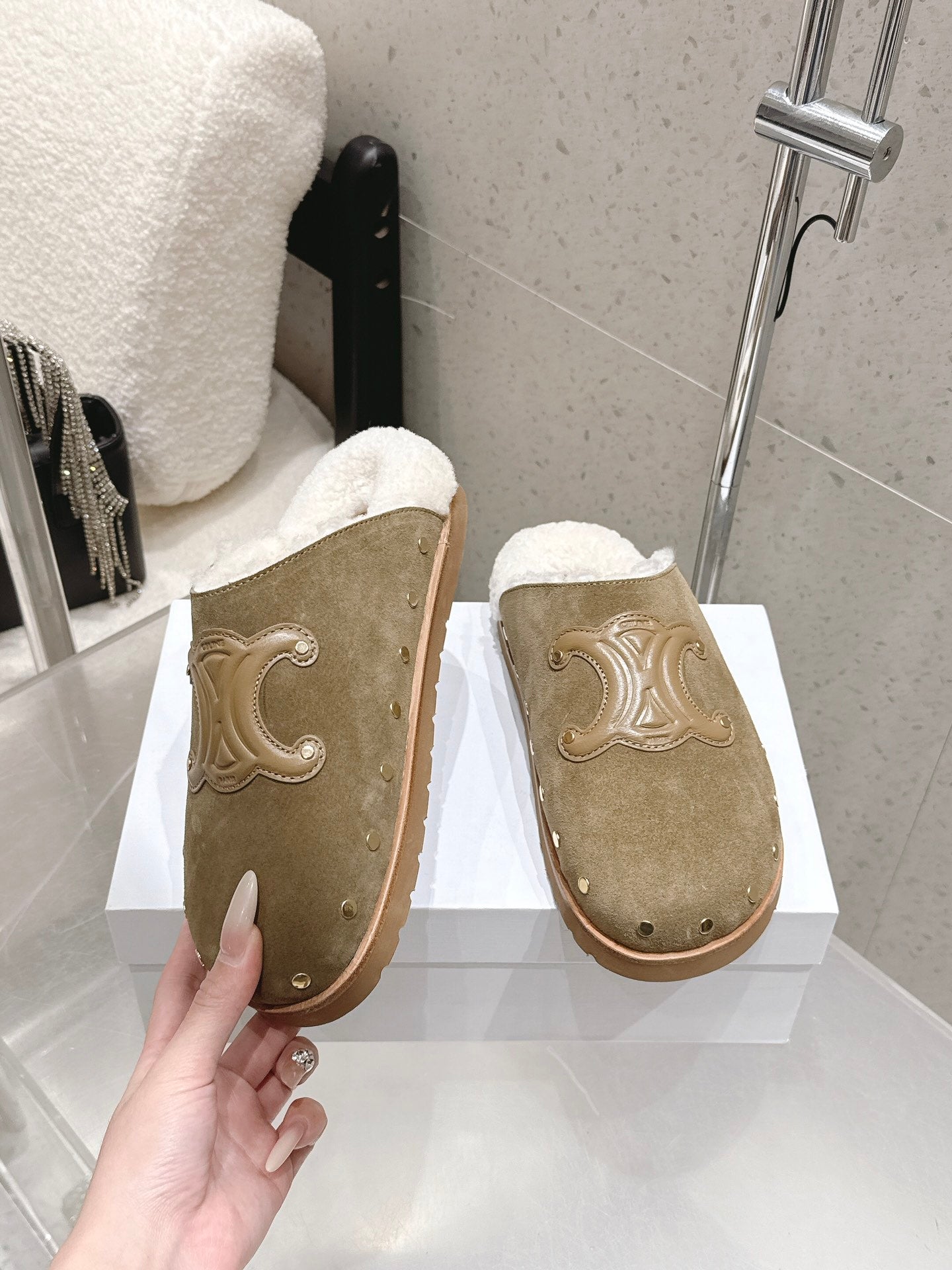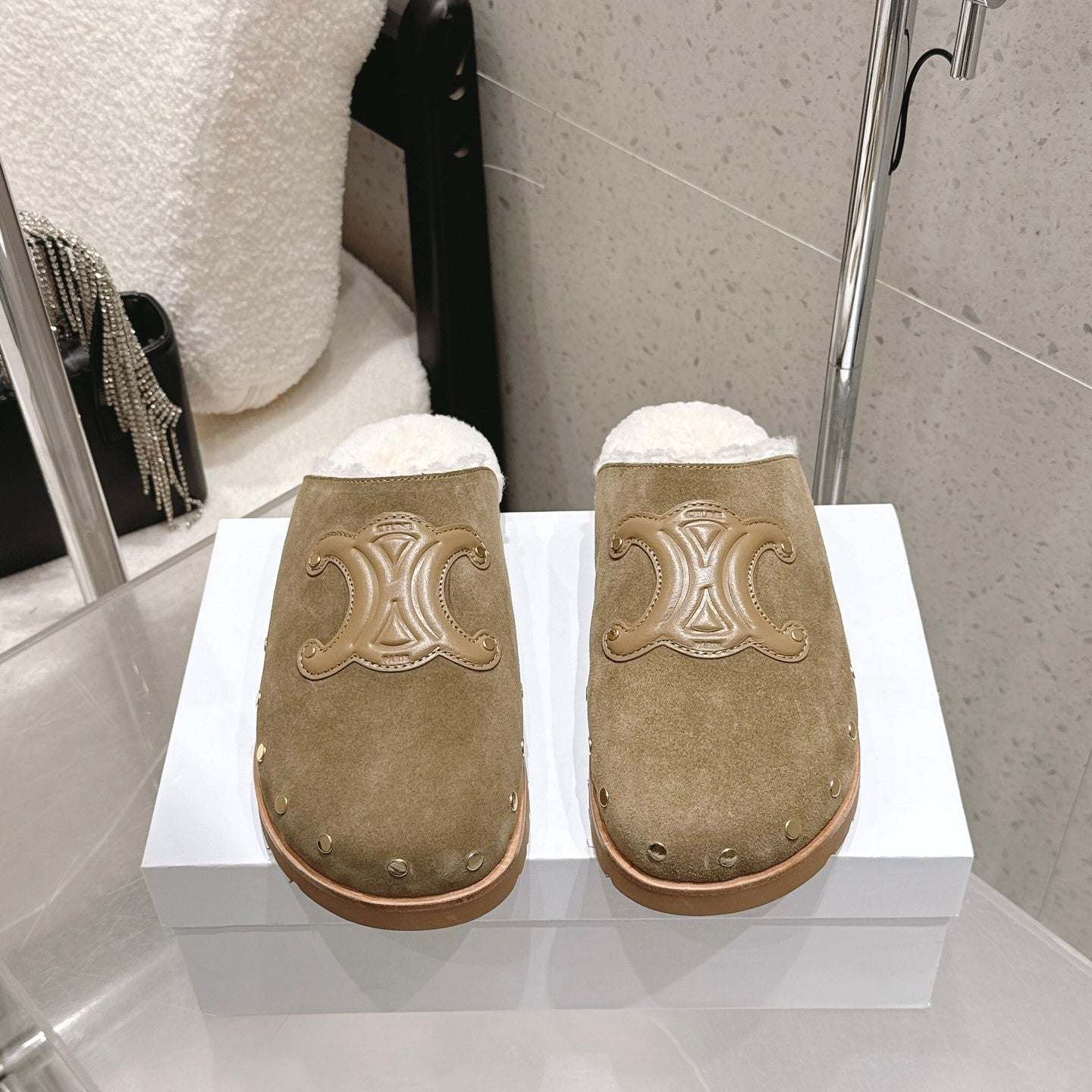 Celine Pitea Clogs Taupe Suede Calfskin Shearling 610961