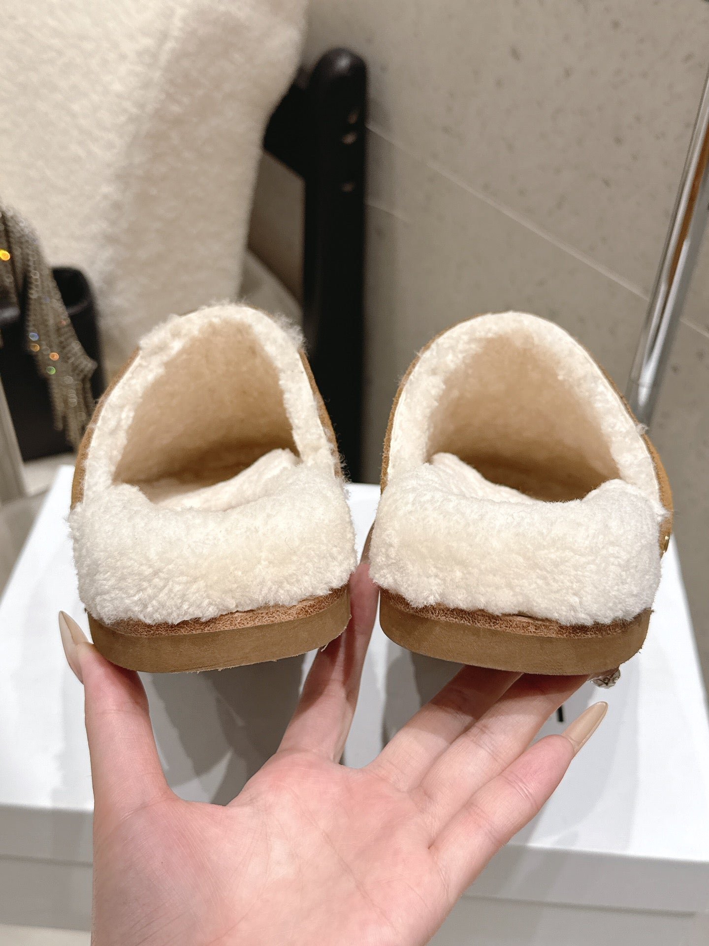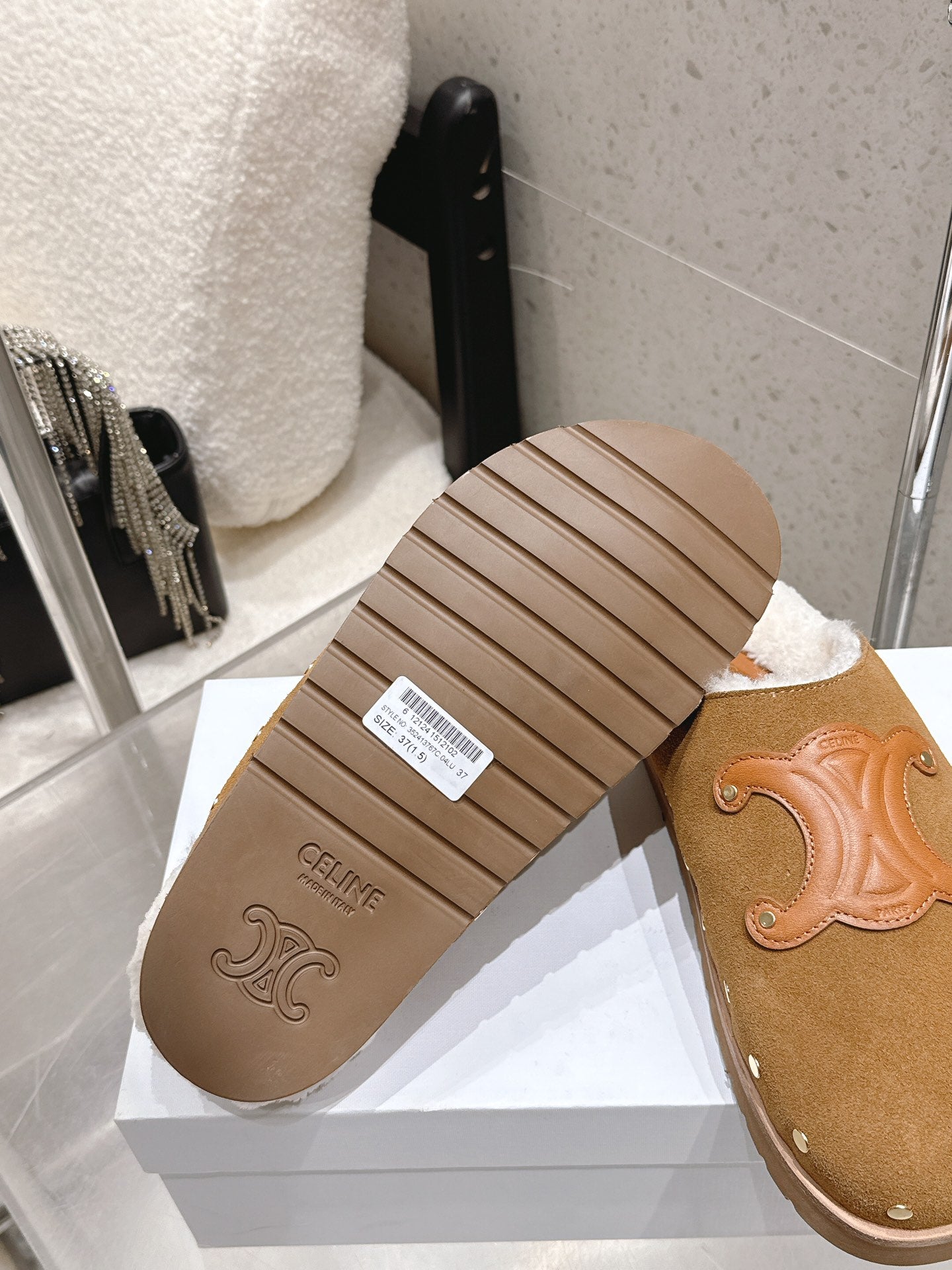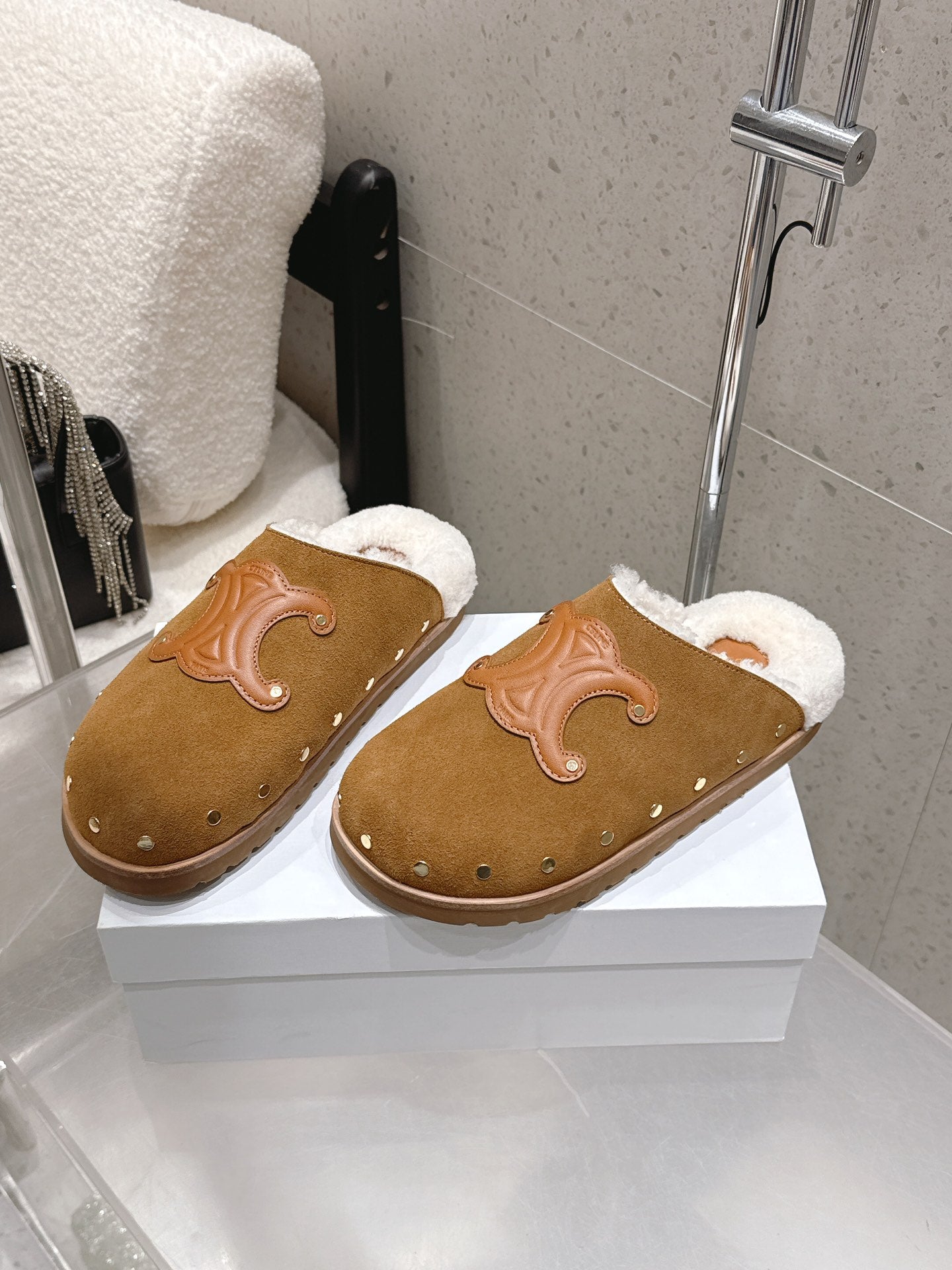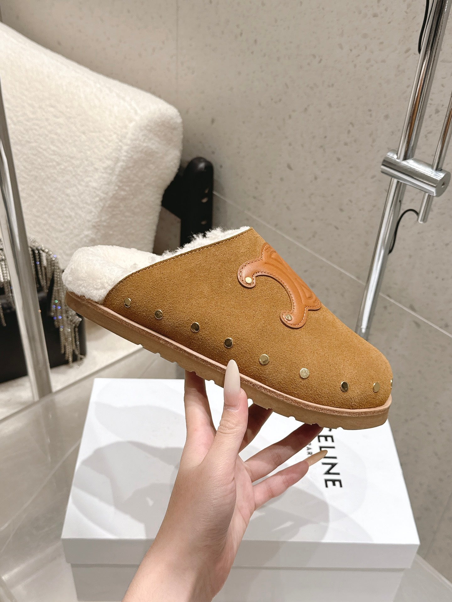 Celine Pitea Clogs Taupe Suede Calfskin Shearling 610961