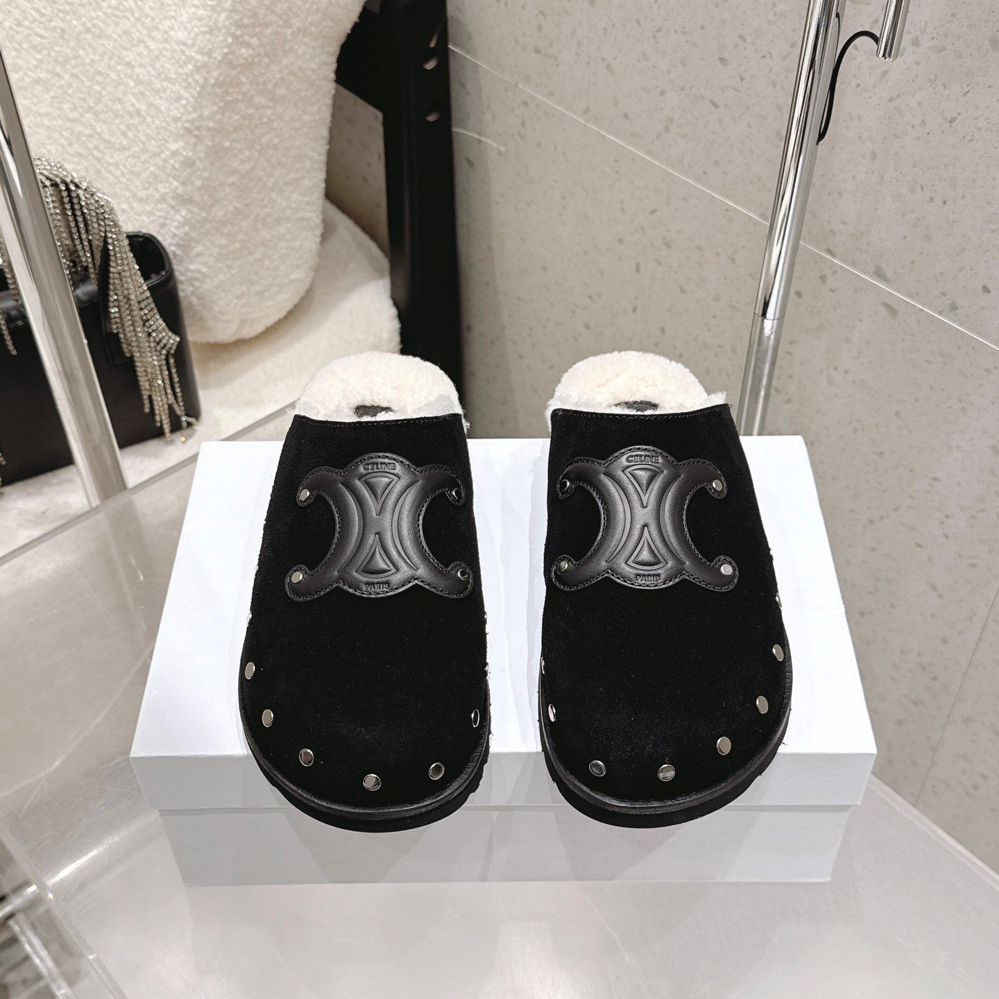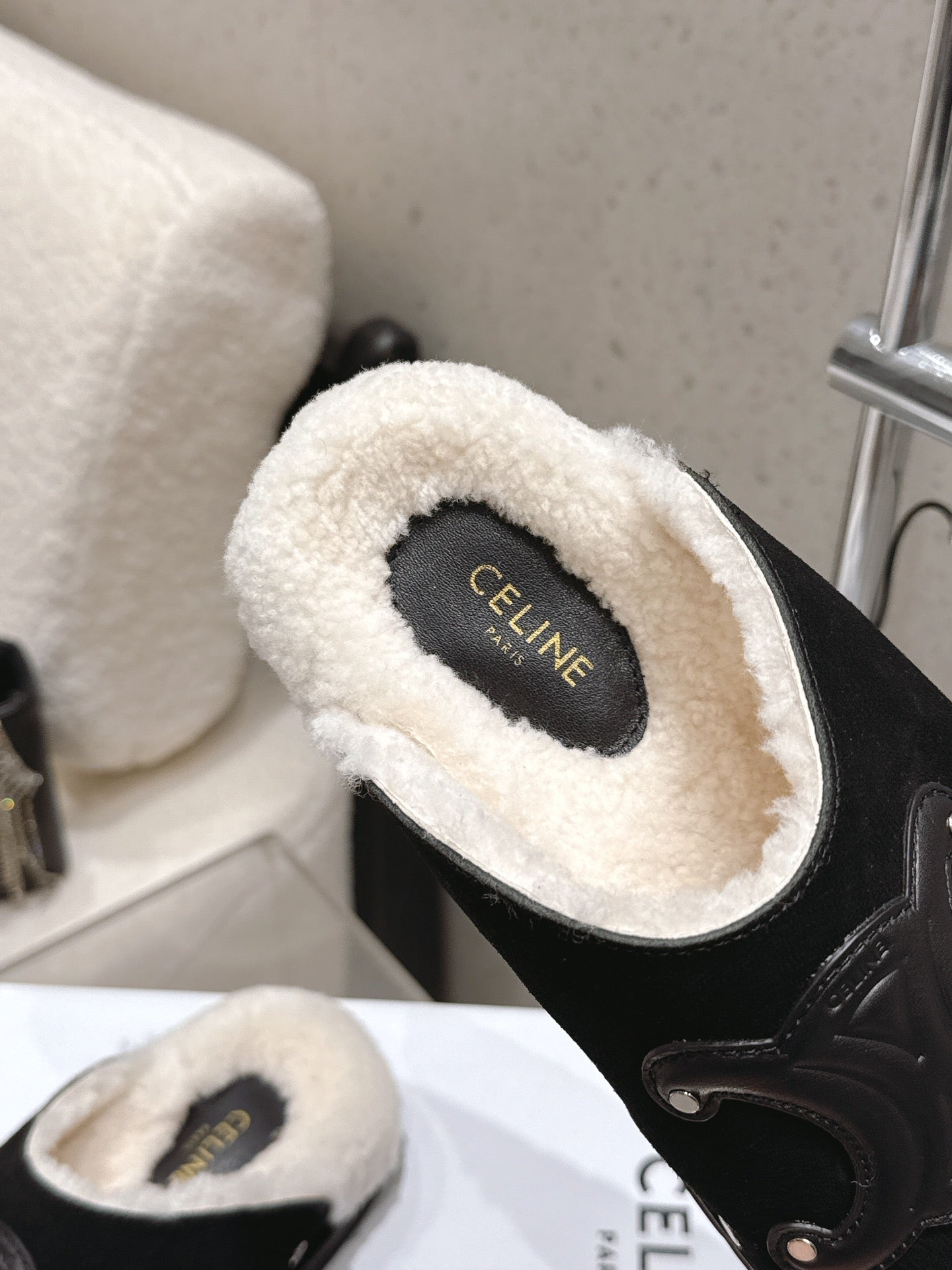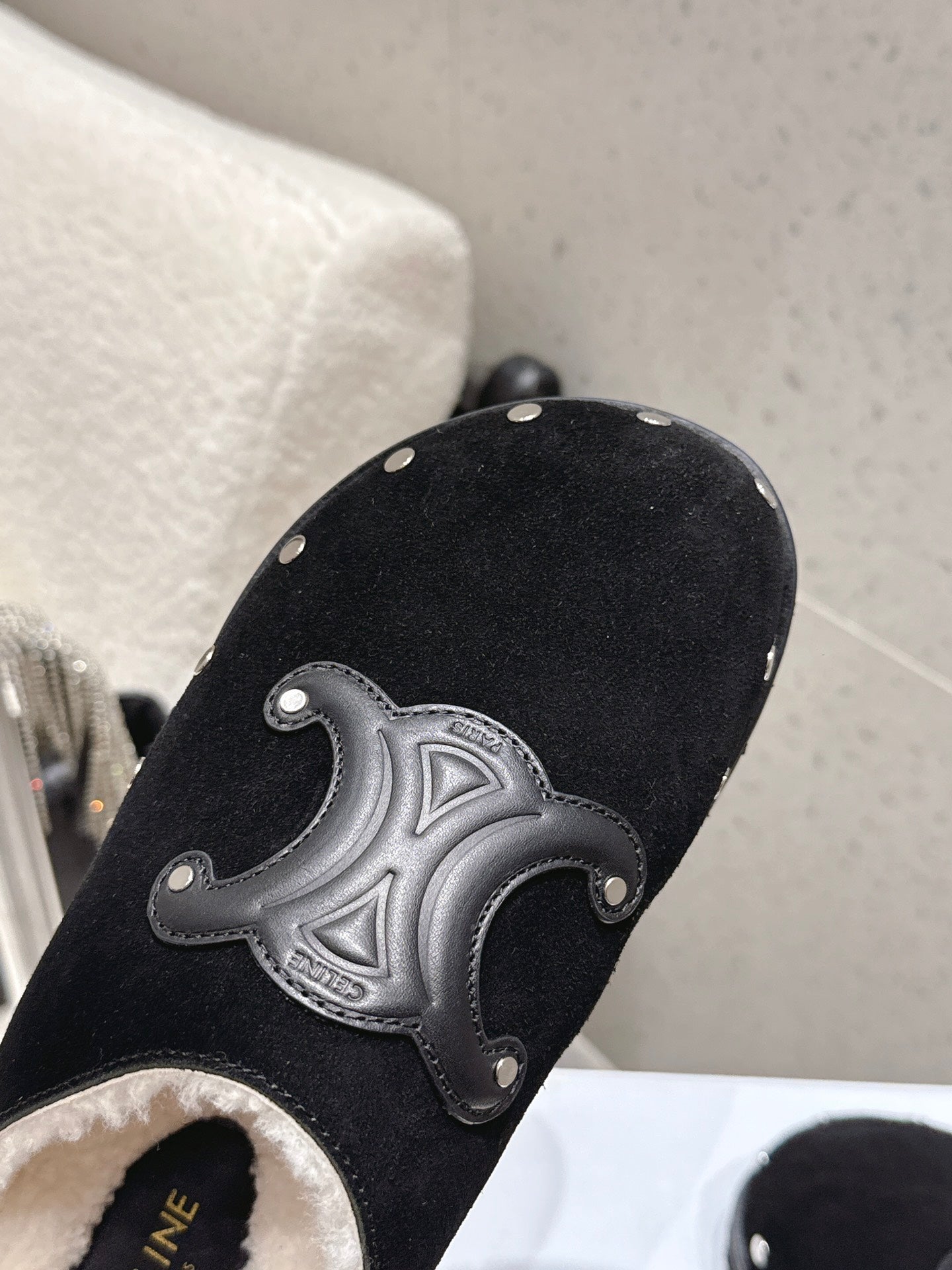 Celine Pitea Clogs Black Suede Calfskin Shearling 610962