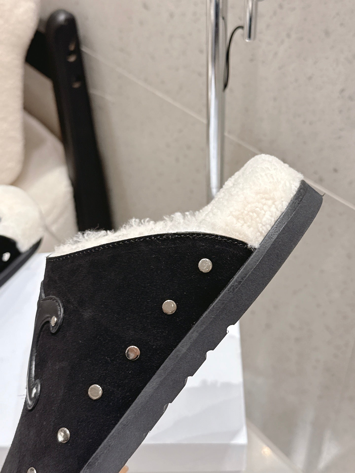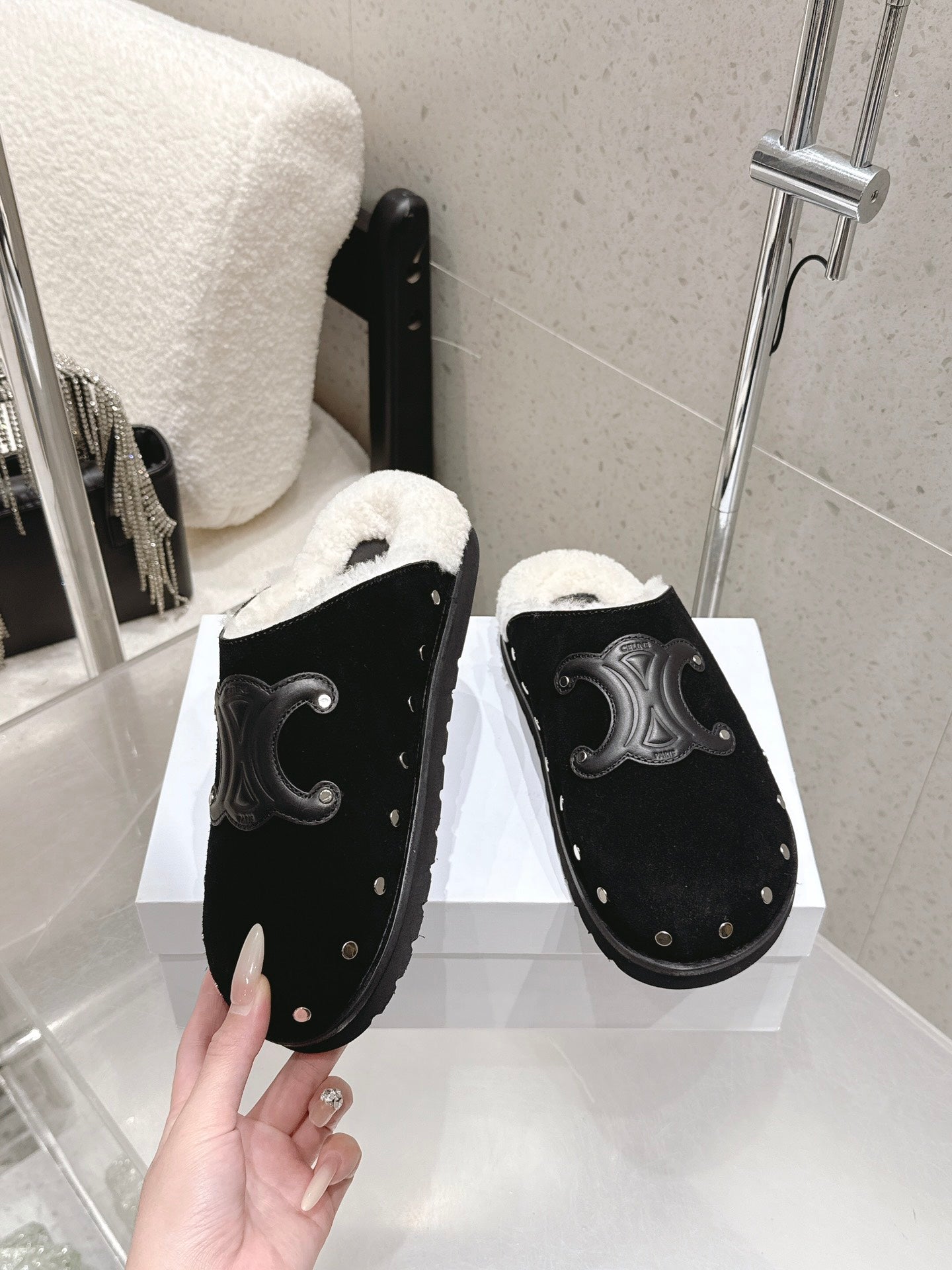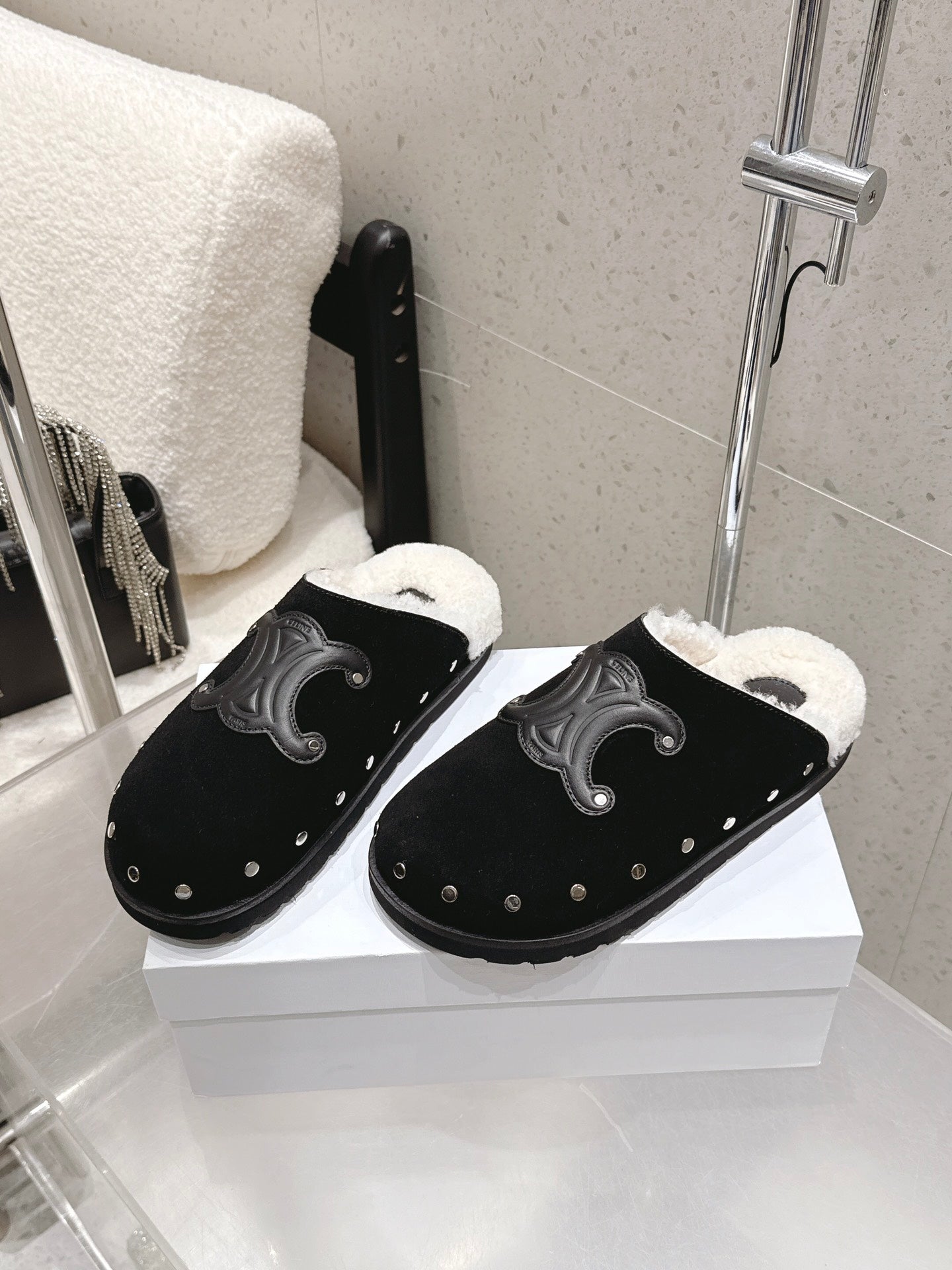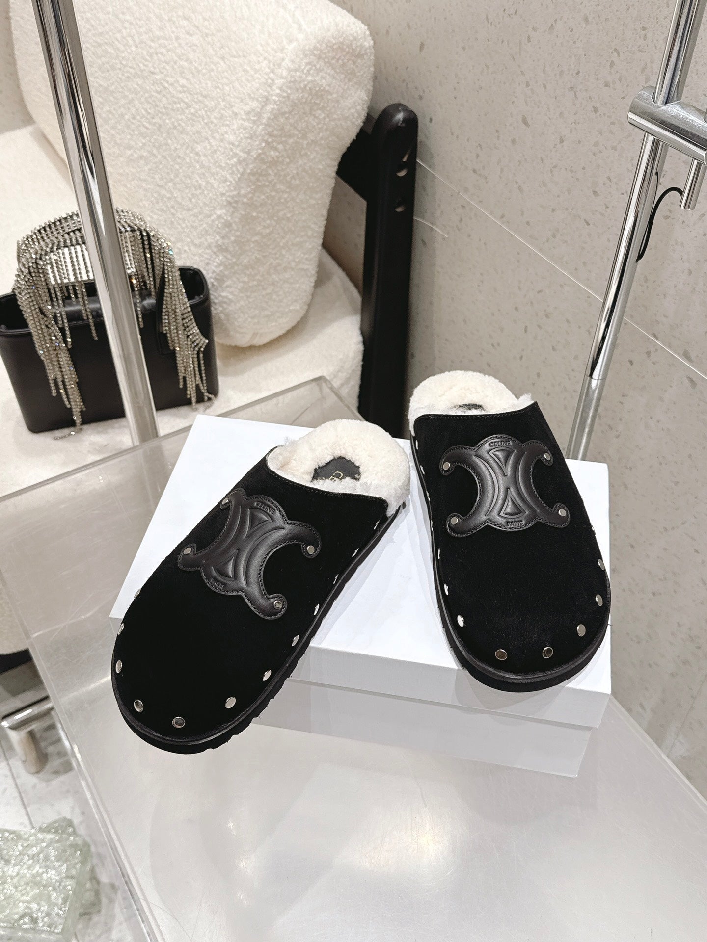 Celine Pitea Clogs Black Suede Calfskin Shearling 610962