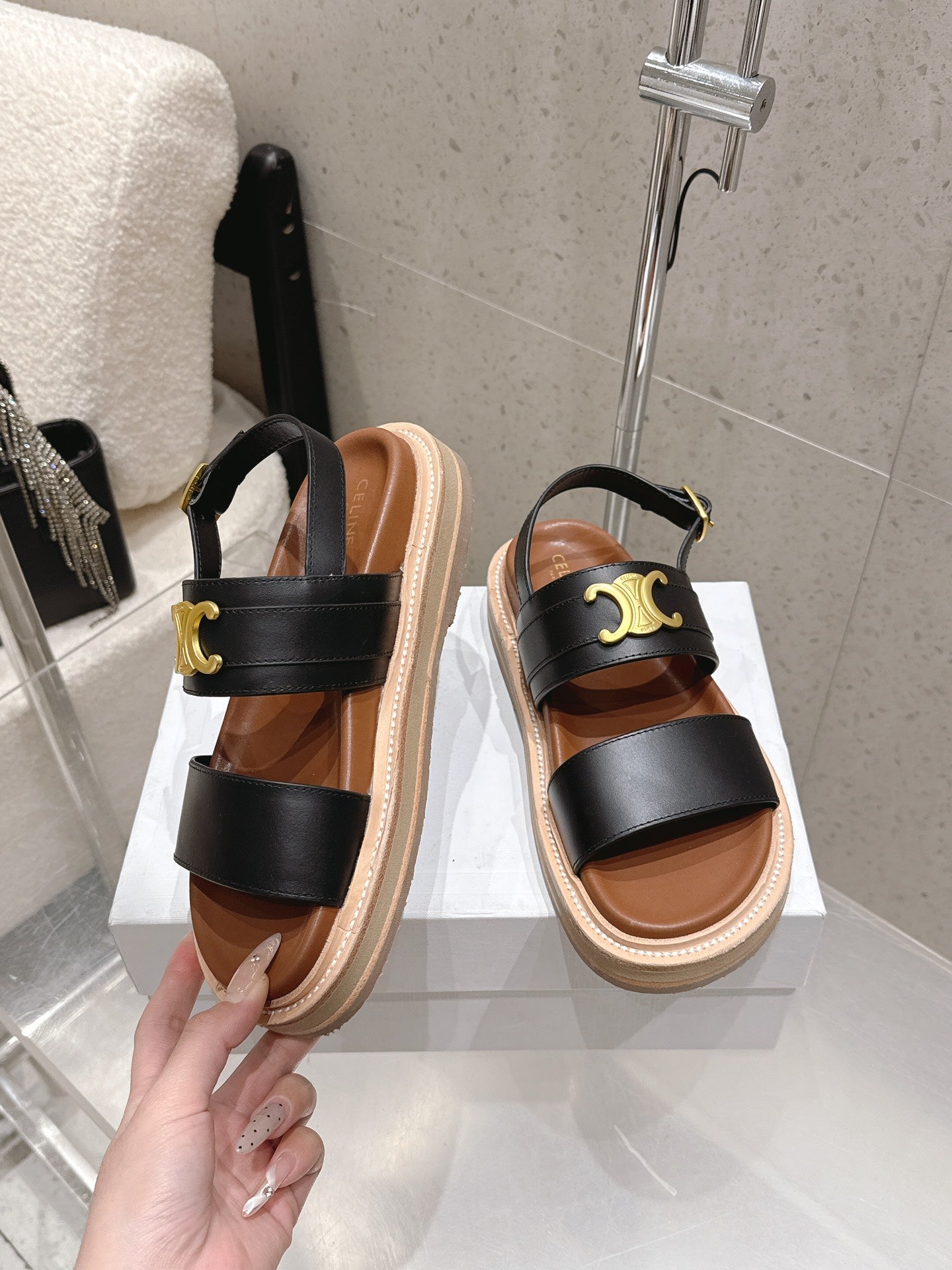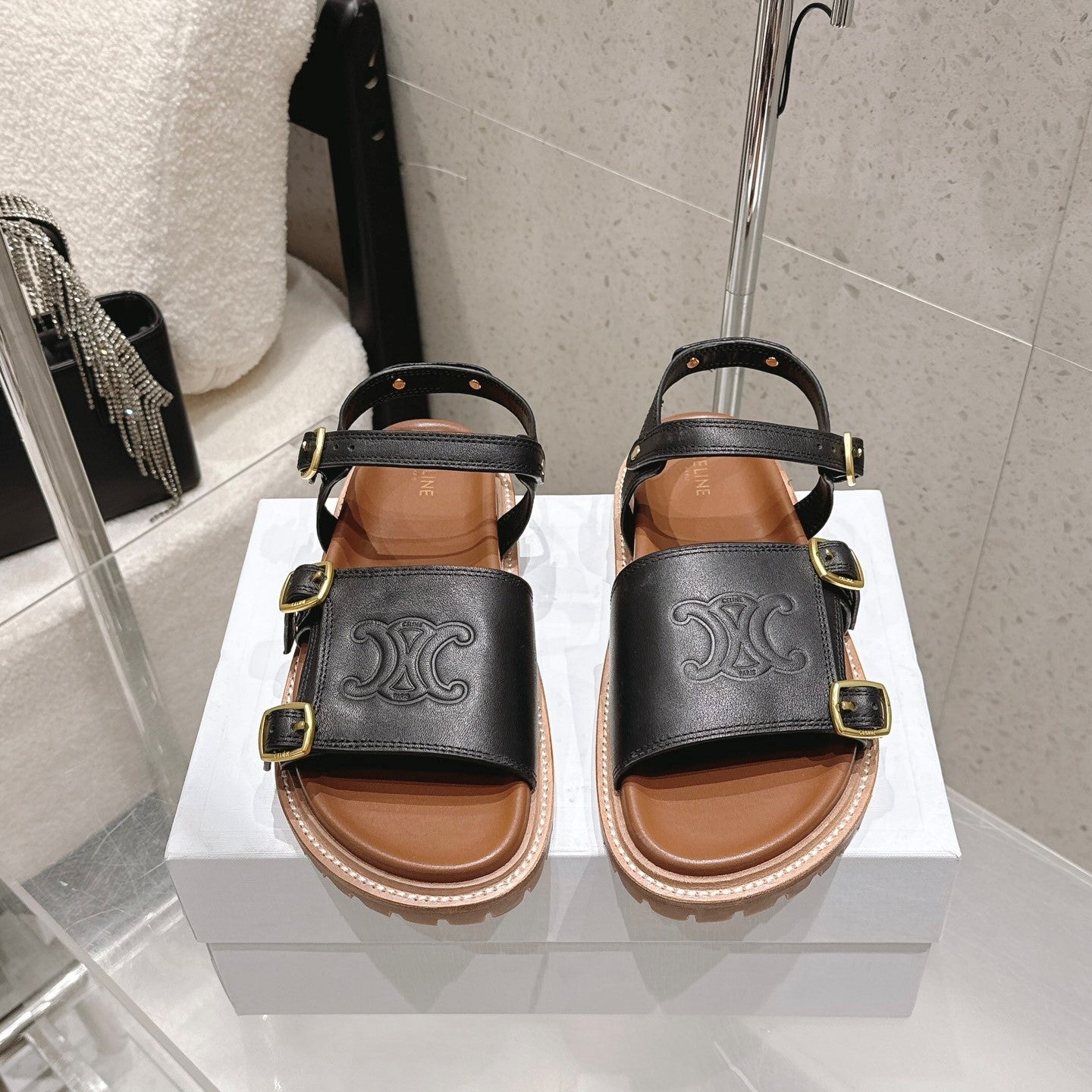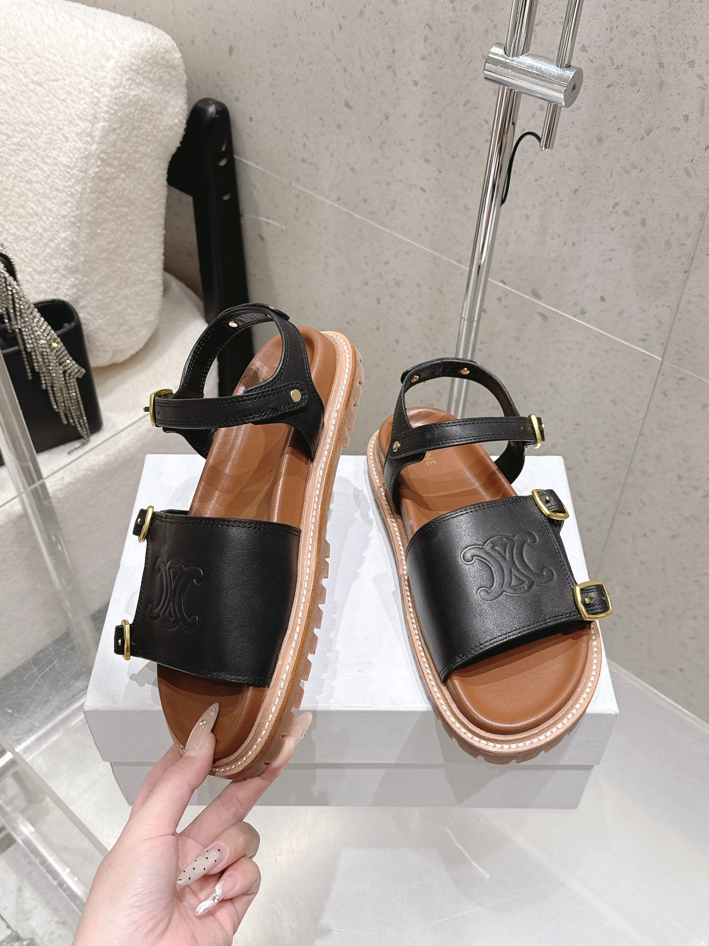 Celine Triomphe Sandals Black Brown Calfskin 610937