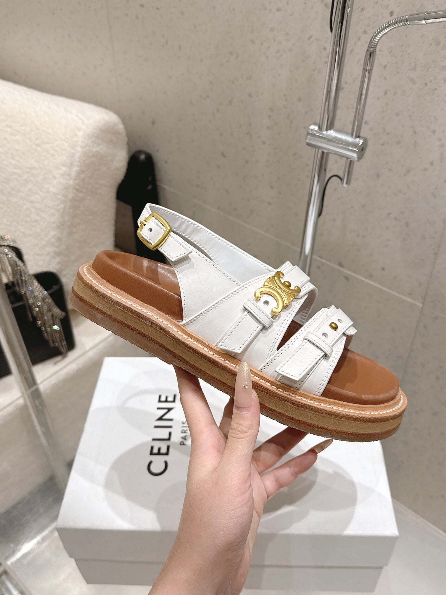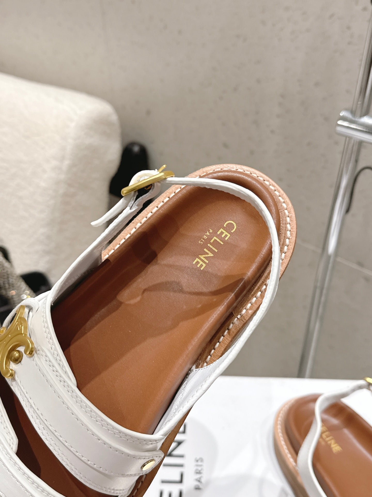 Celine Triomphe Sandals White Brown Calfskin 610939