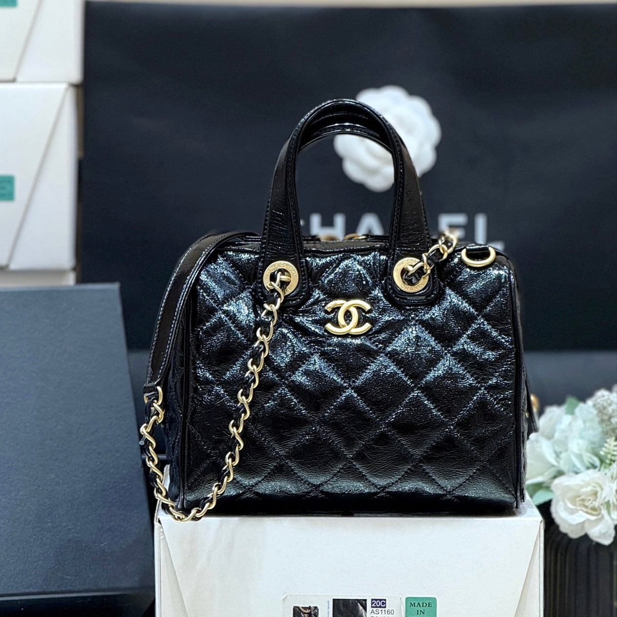 CC 25s Maxi Bowling Bag 21 Black Patent Crumpled Calfskin