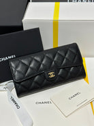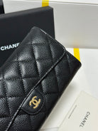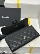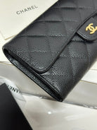 CC Classic Long Flap Wallet Black Quilted Caviar Gold Buckle 243676