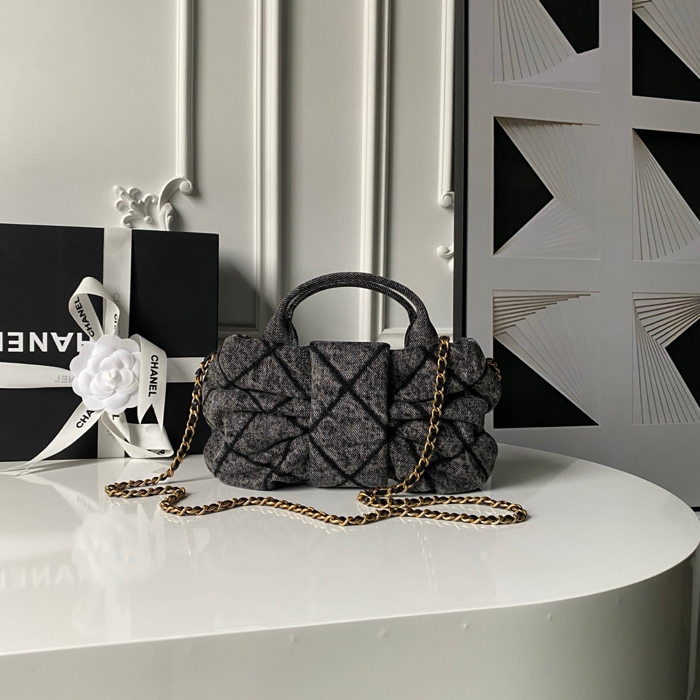 Chanel 25K Bow Bag Dark Gray Gold Denim Leather 295188