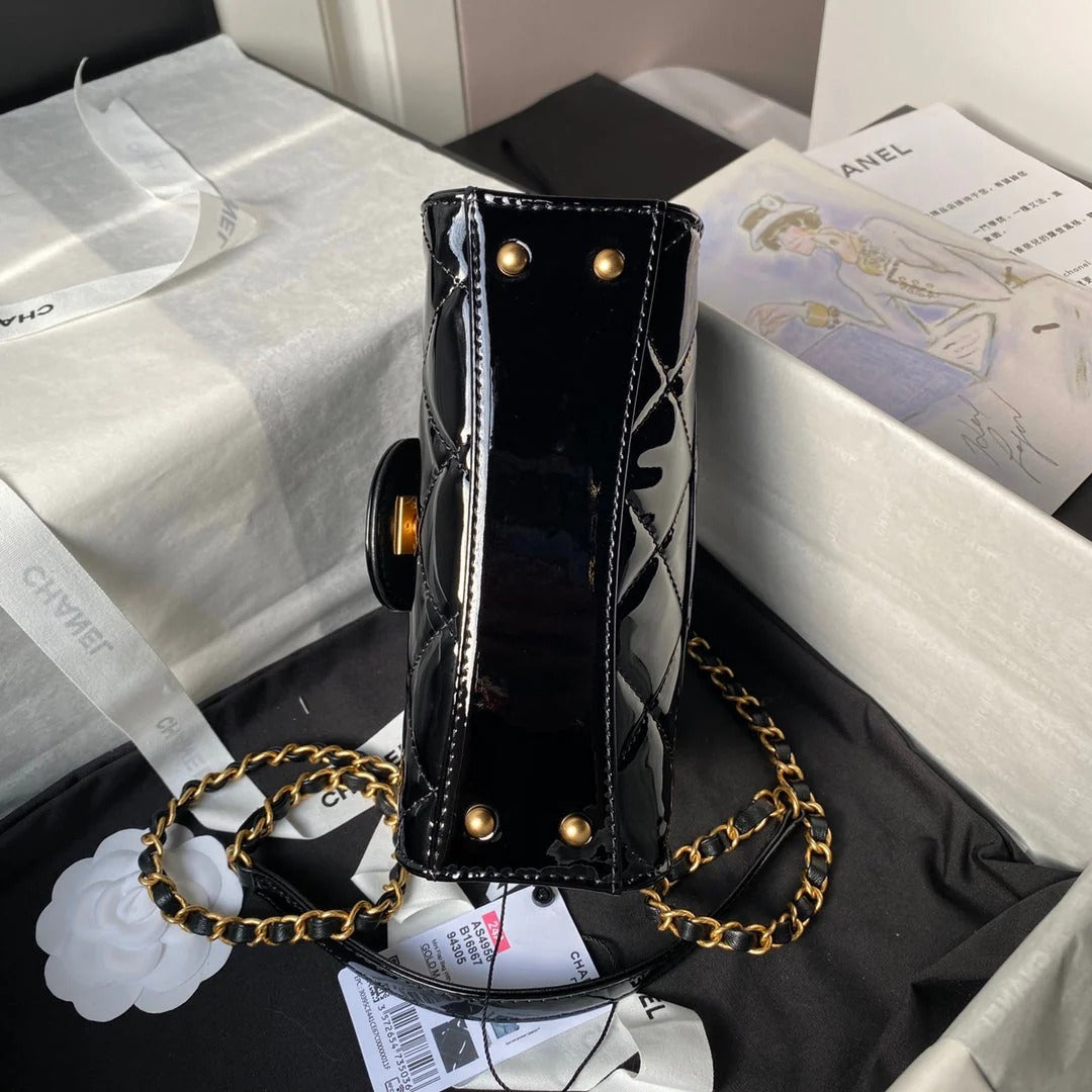 CC 25S FLAP BAG 21 CM IN BLACK PATENT LAMBSKIN WITH TOP HANDLE