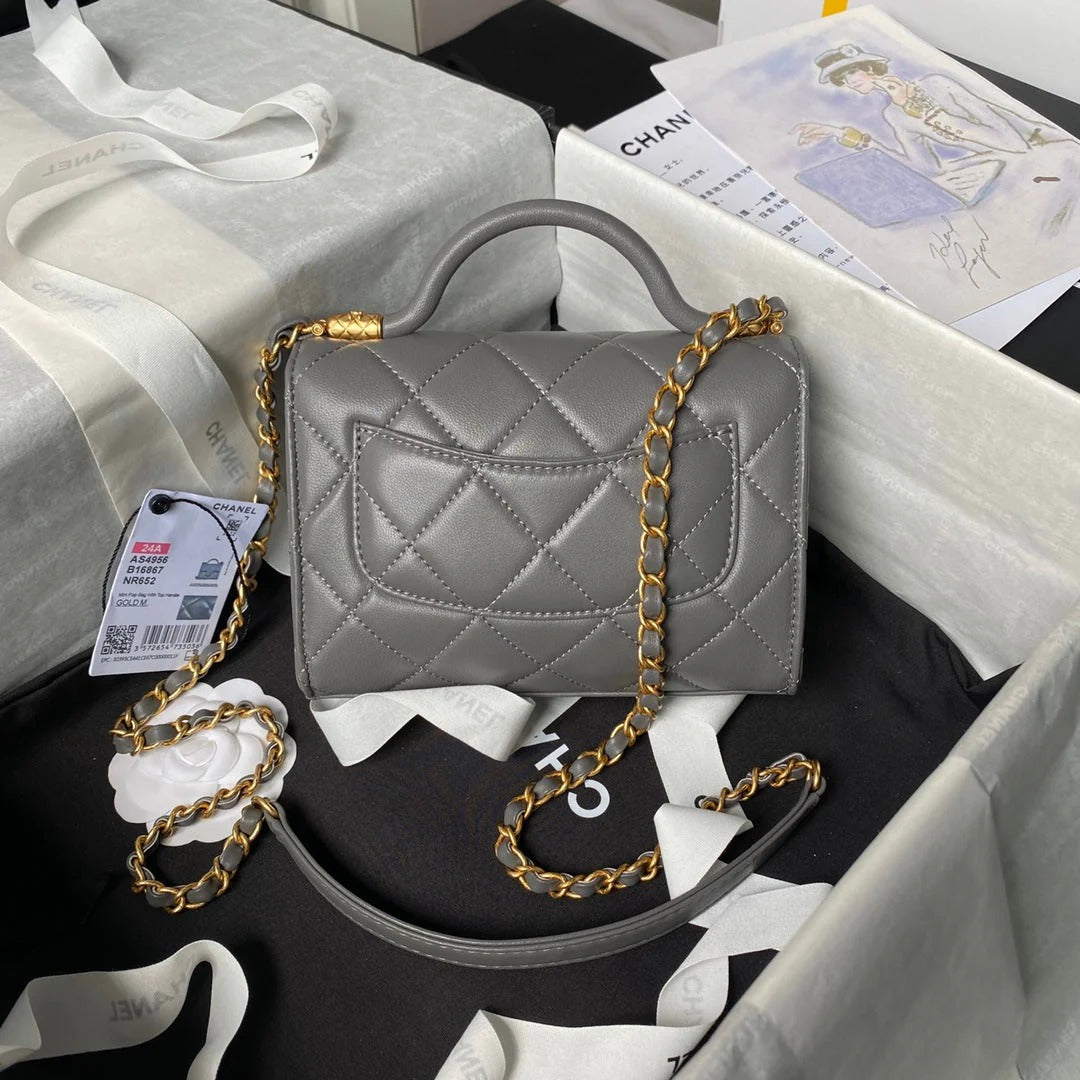 CC 25S FLAP BAG 18 CM IN DARK GREY LAMBSKIN WITH TOP HANDLE