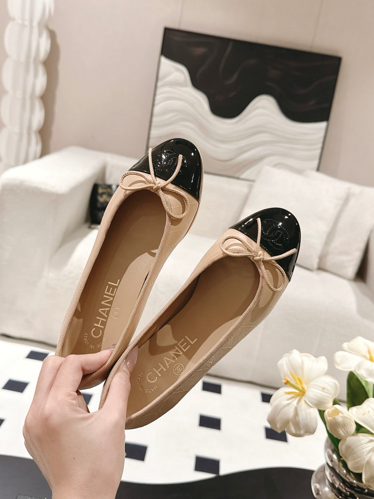 cc 25c ballet flat cross line pattern beige lambskin 237484