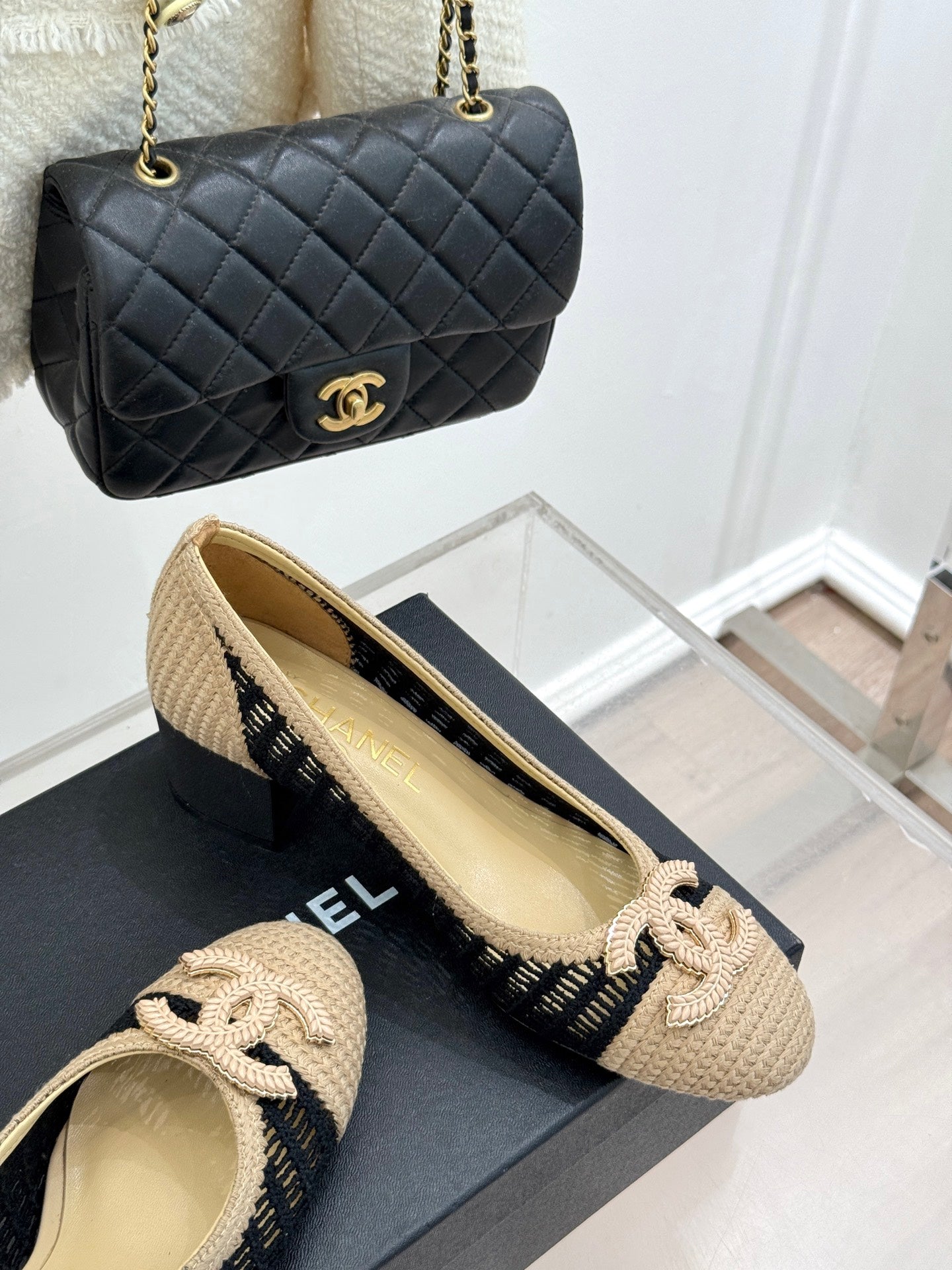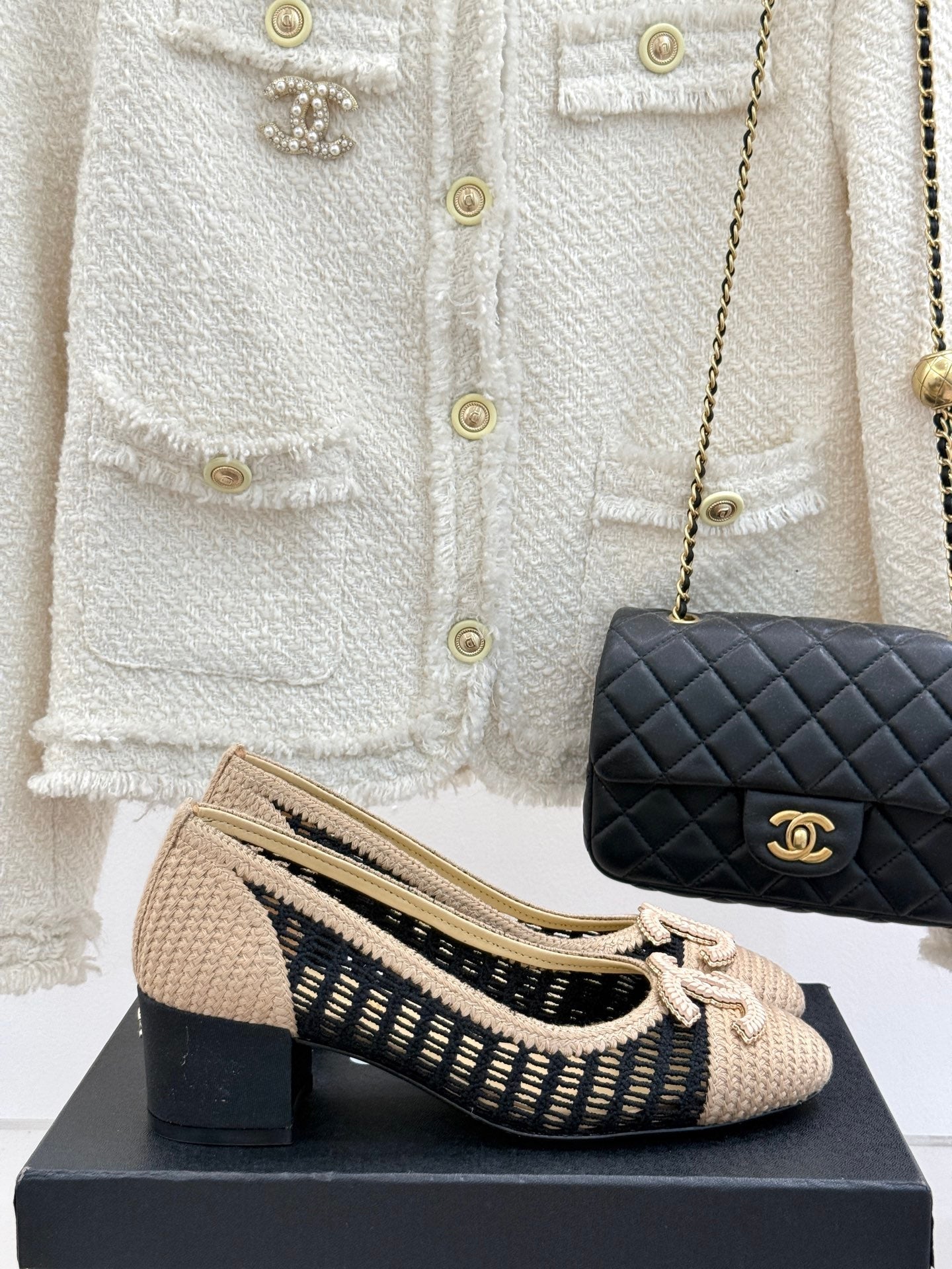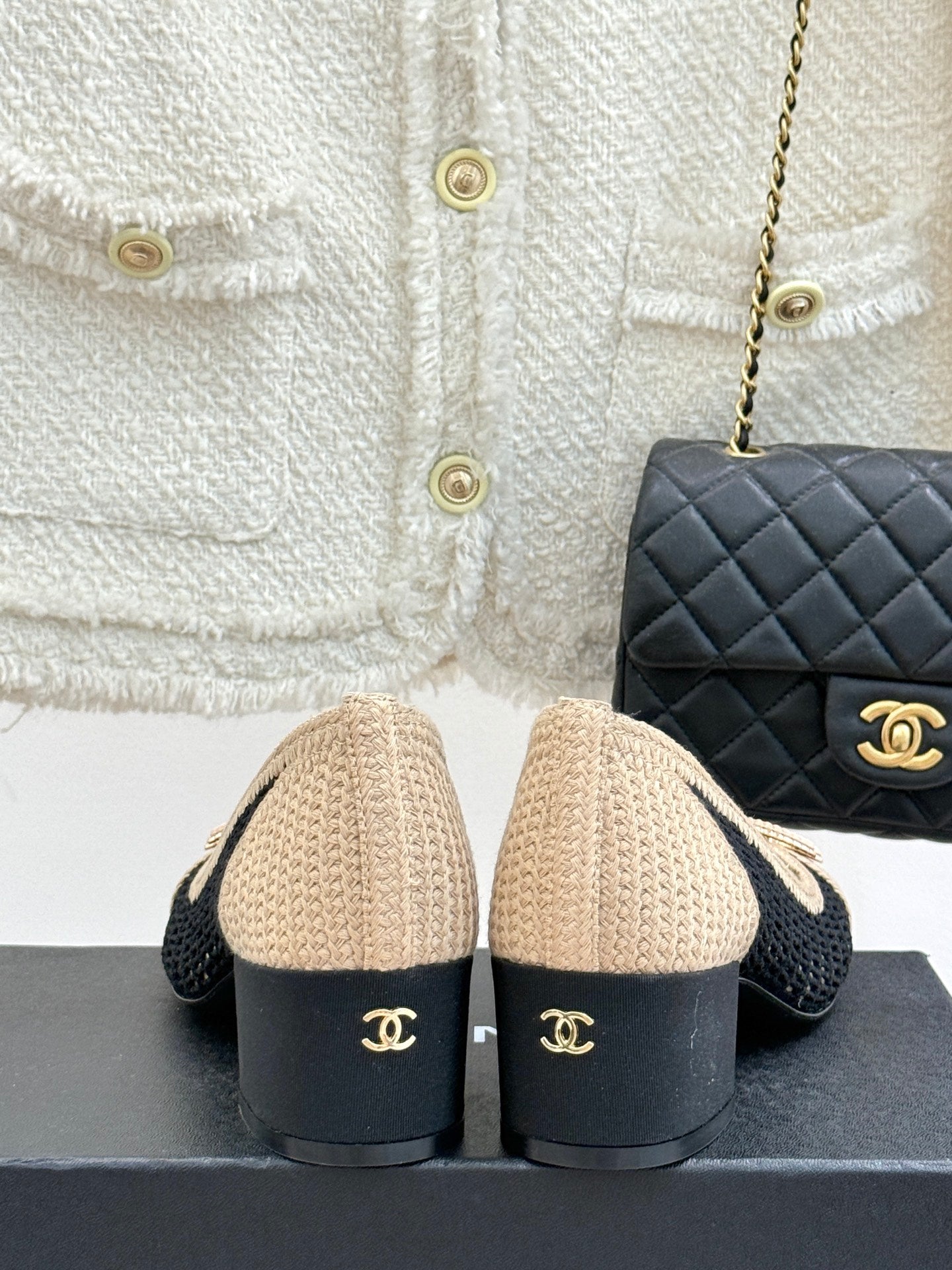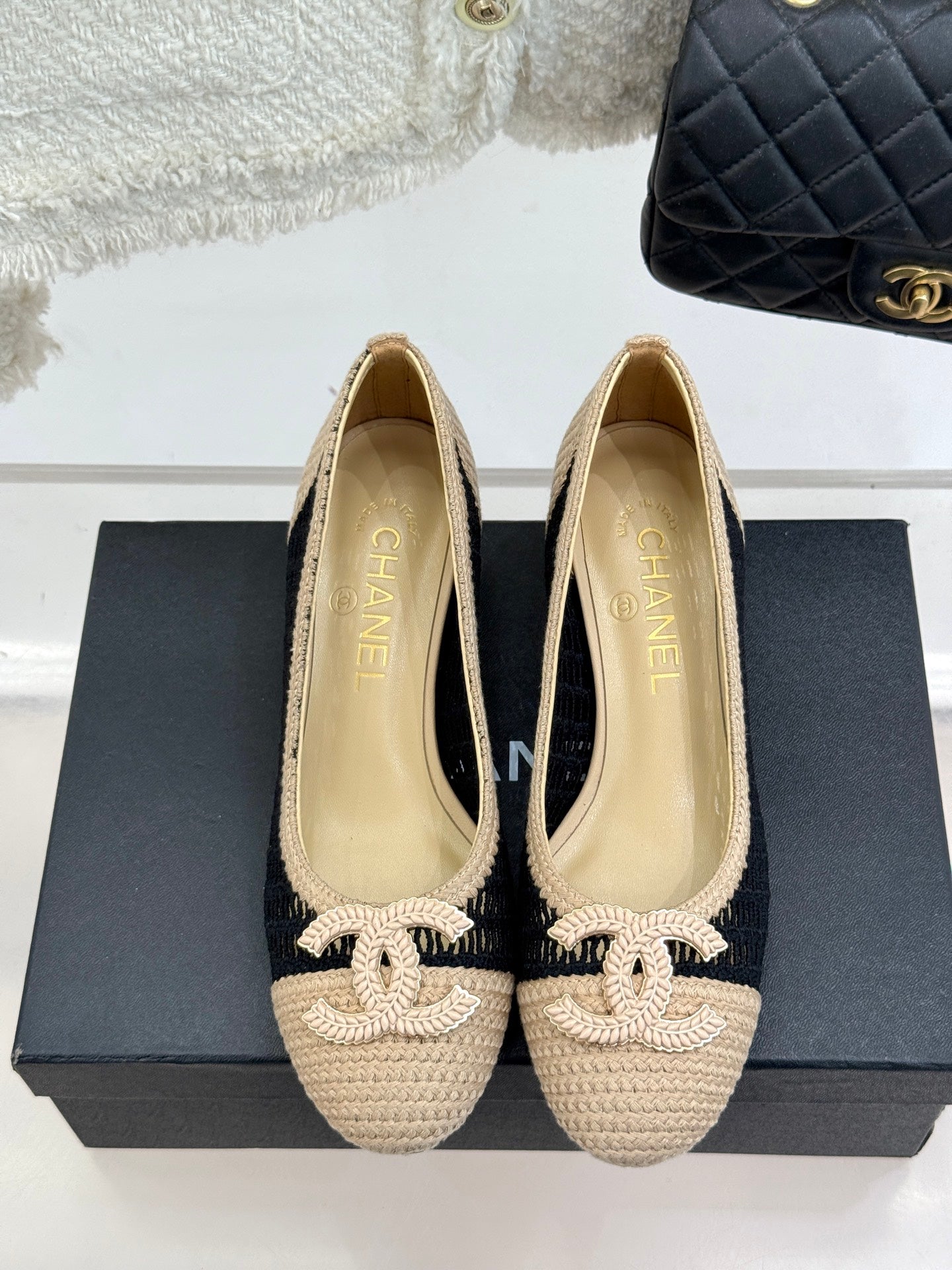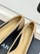 CC 25P Hollow Double C Ballet Flats 50mm Beige Black Raffia 265636