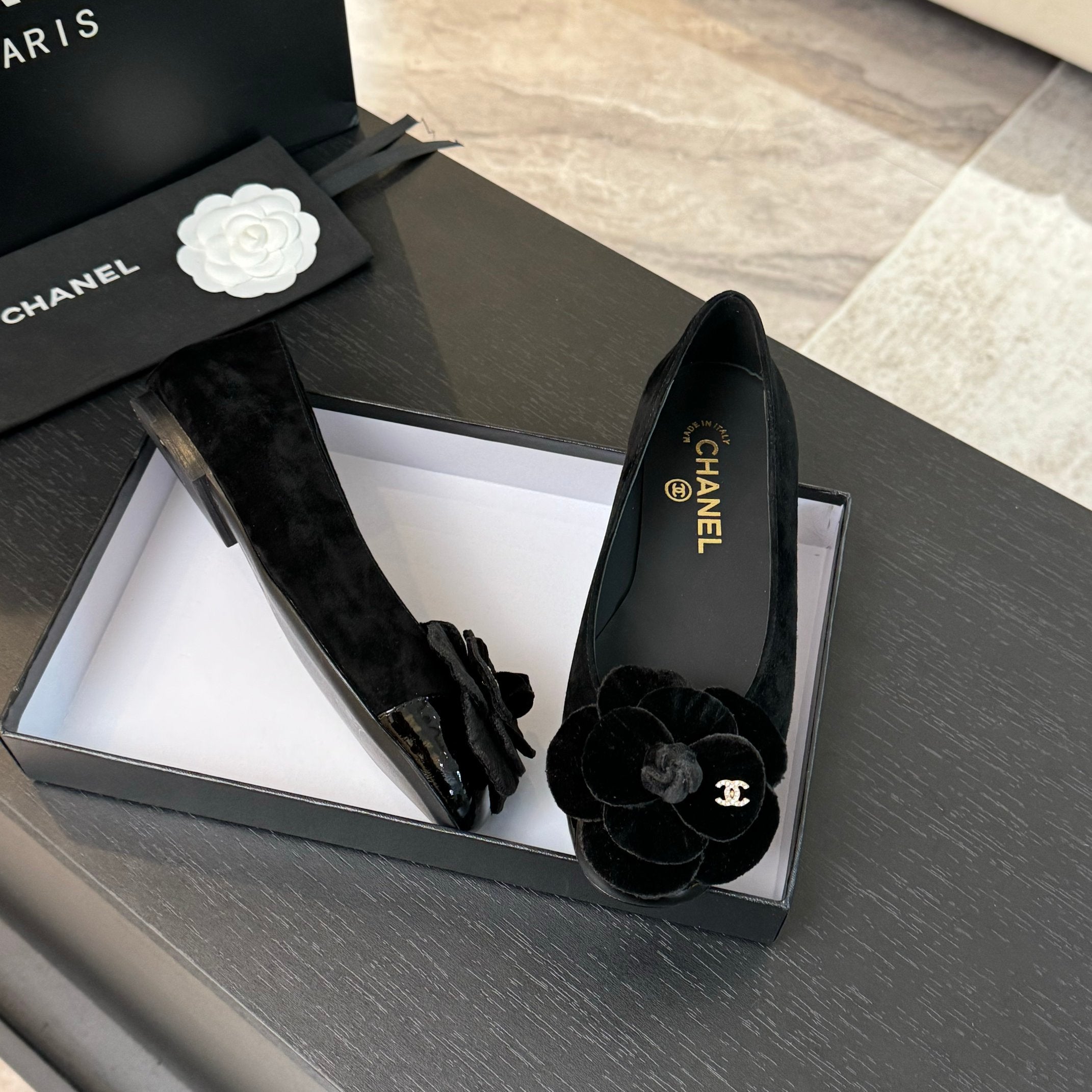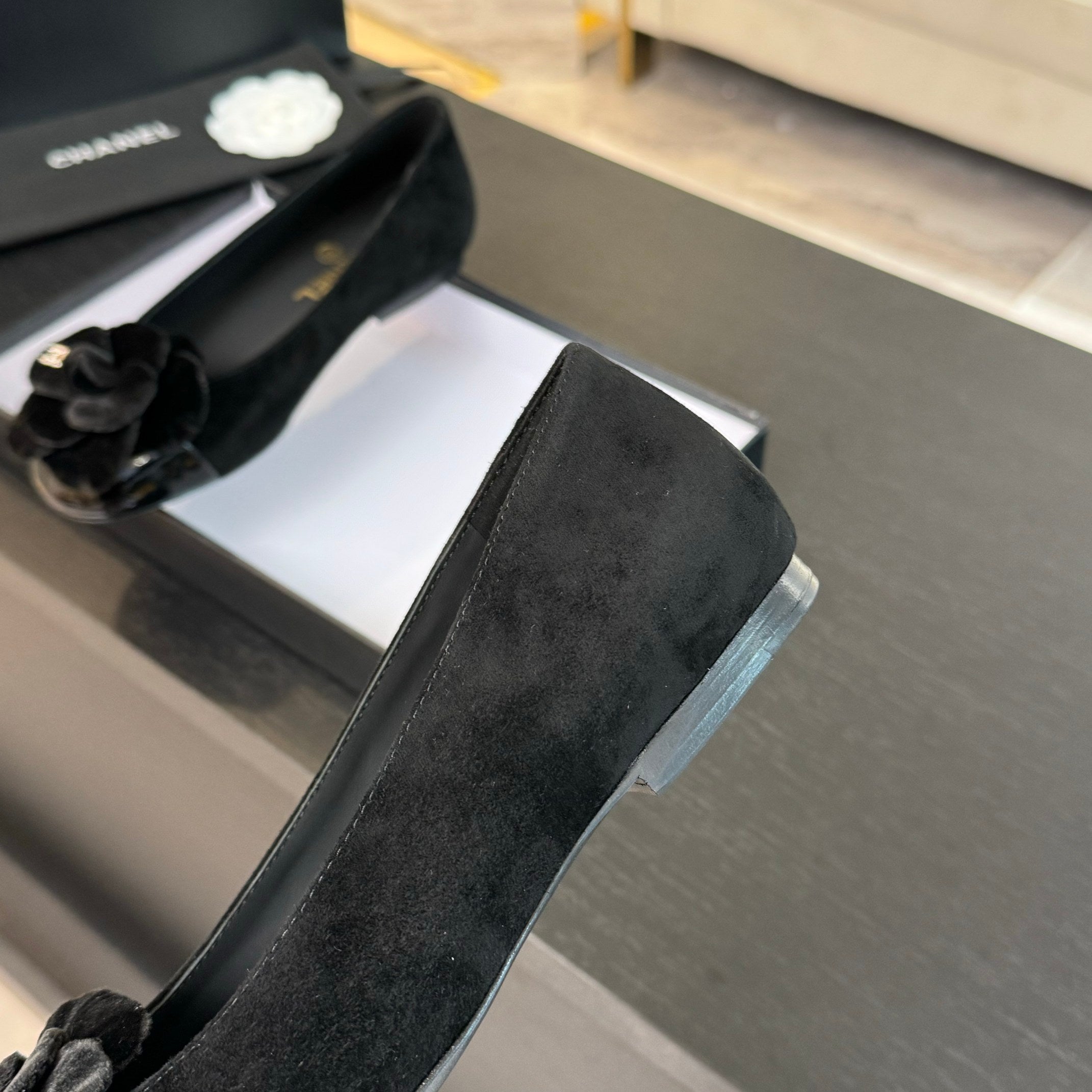 BALLET FLATS IN BLACK SUEDE WITH WHITE CAMELLIA