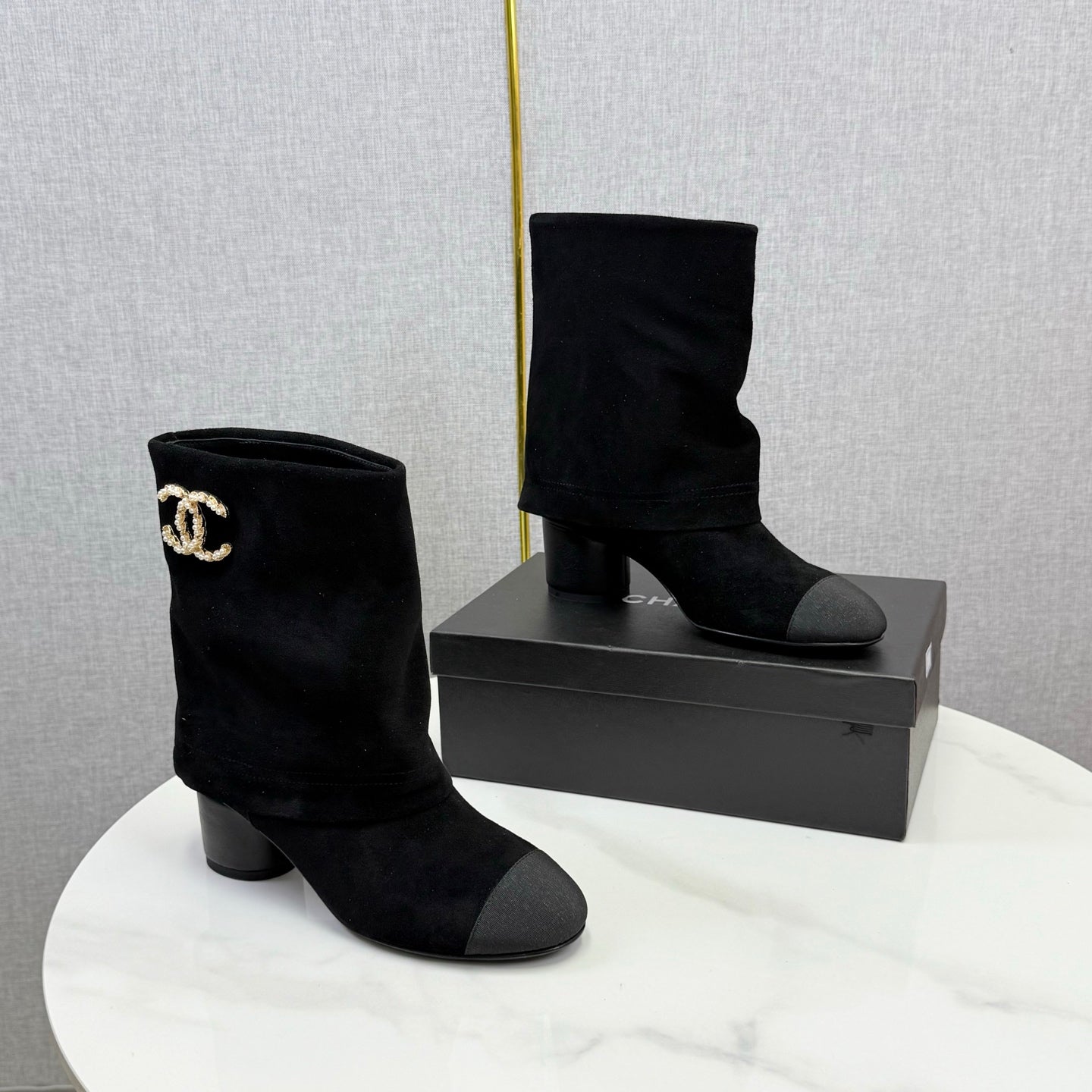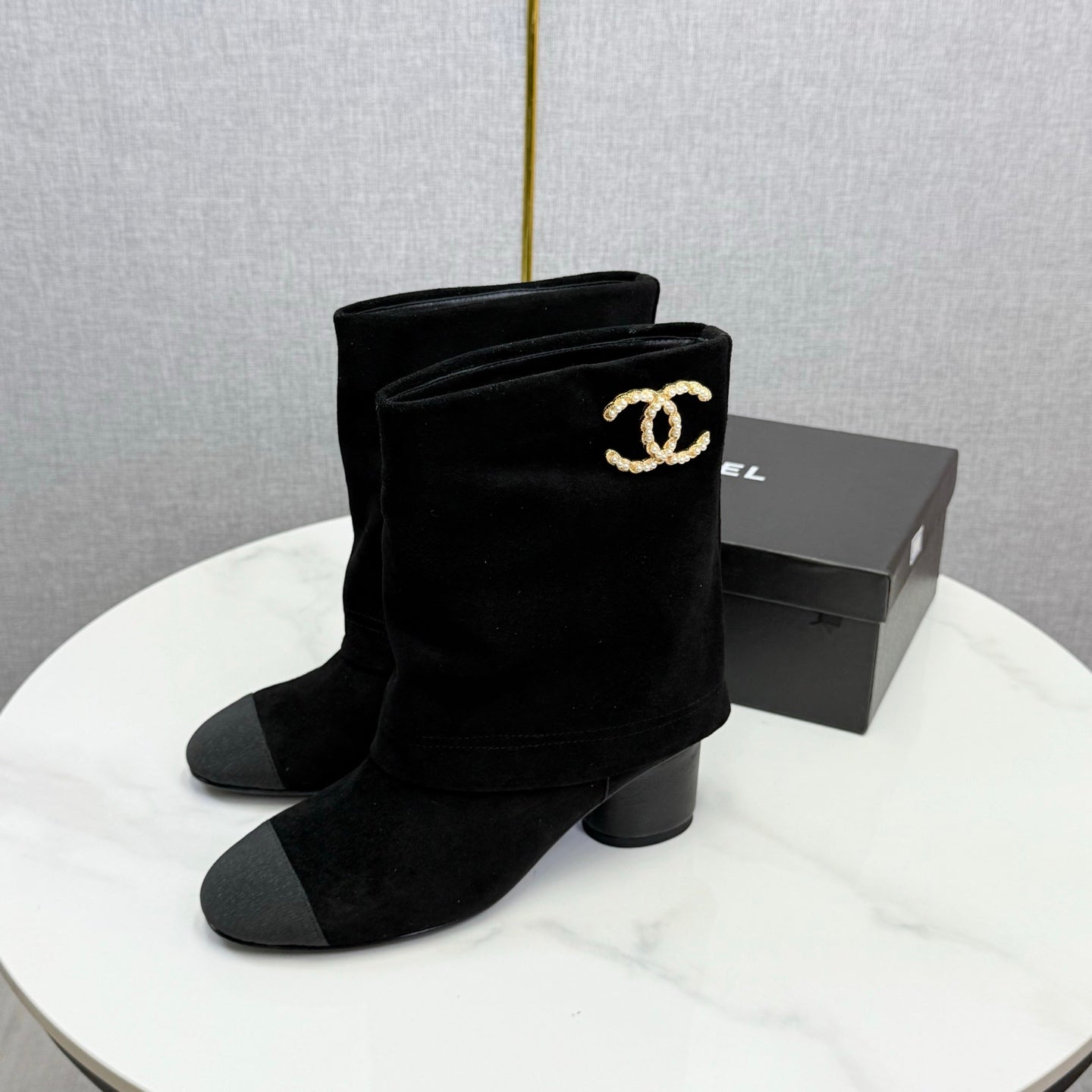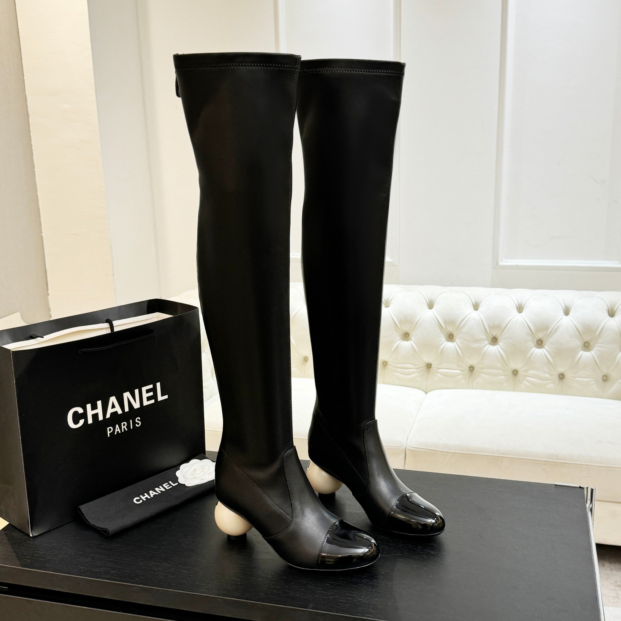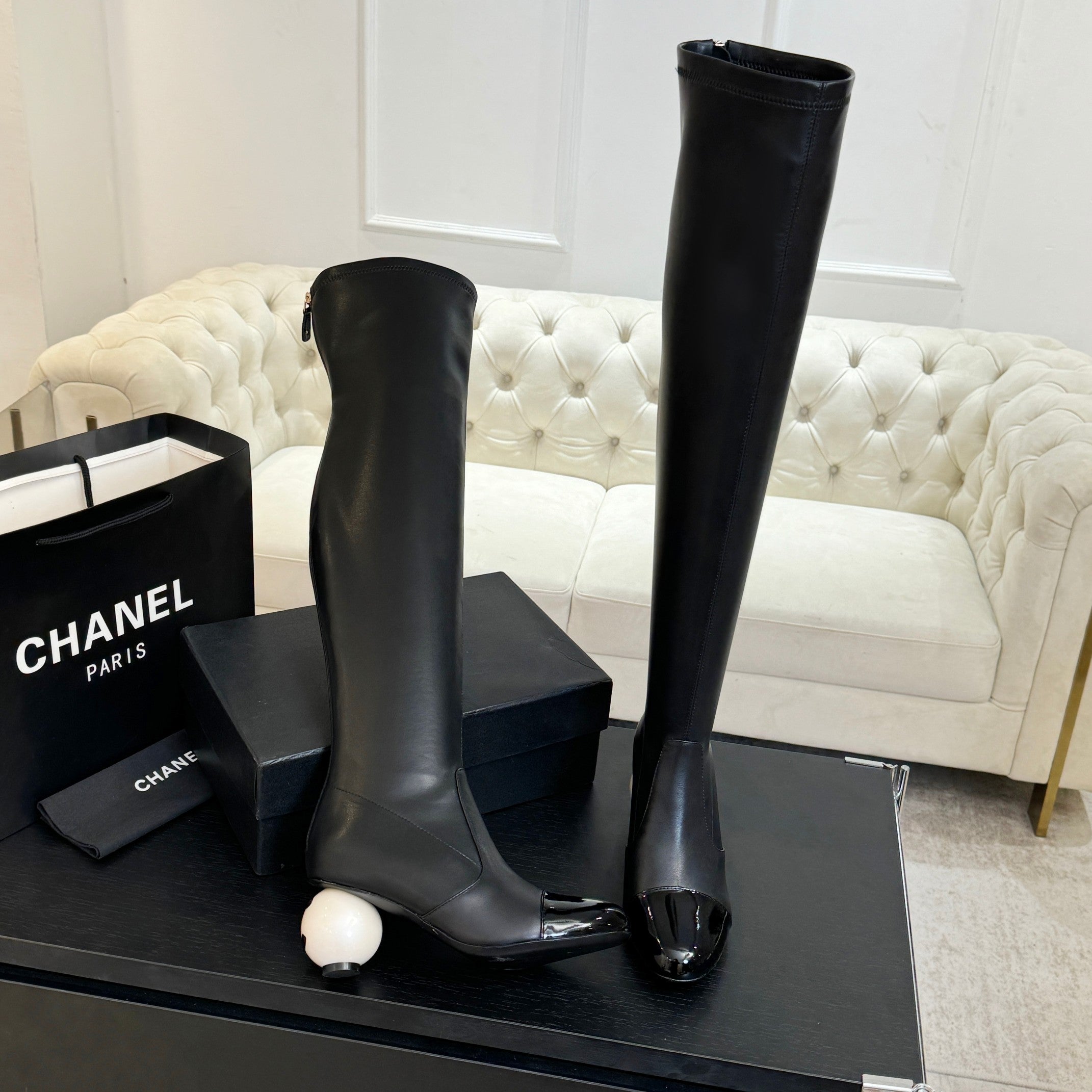 CC 25A Double C Giant Pearl Heel Boots 50mm Black Beige Cowhide 454947