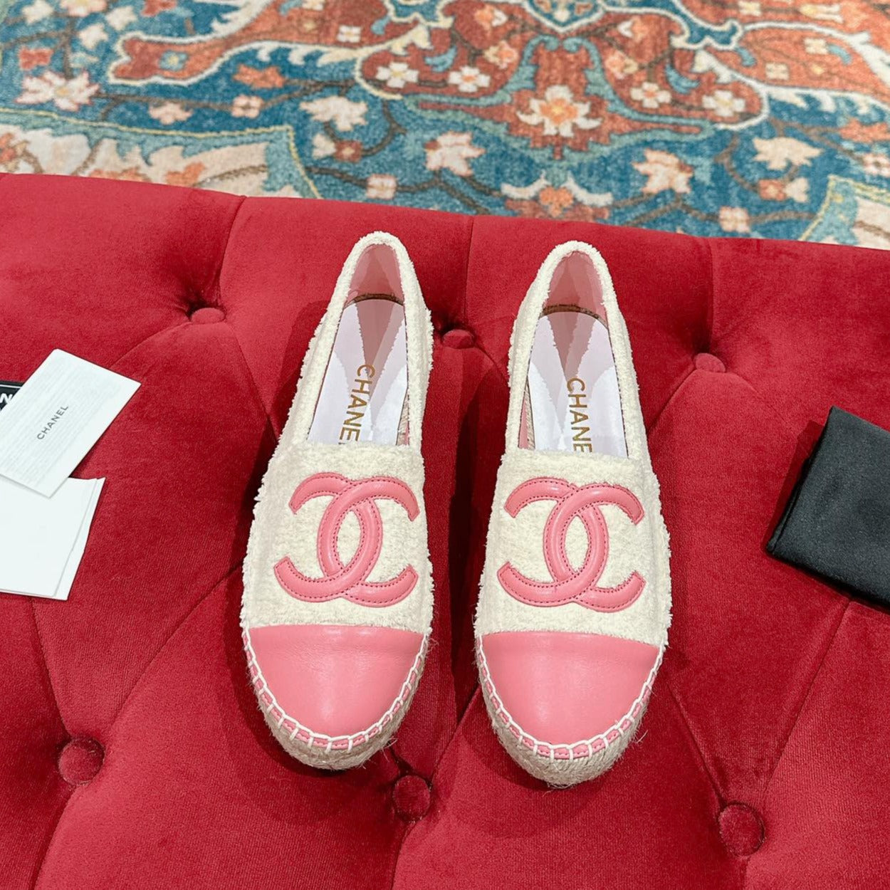 espadrilles pink tweed black patent calfskin