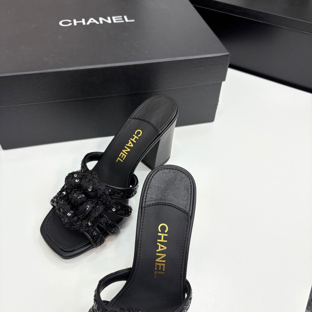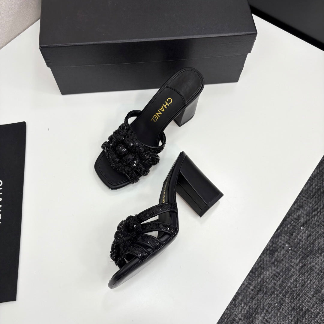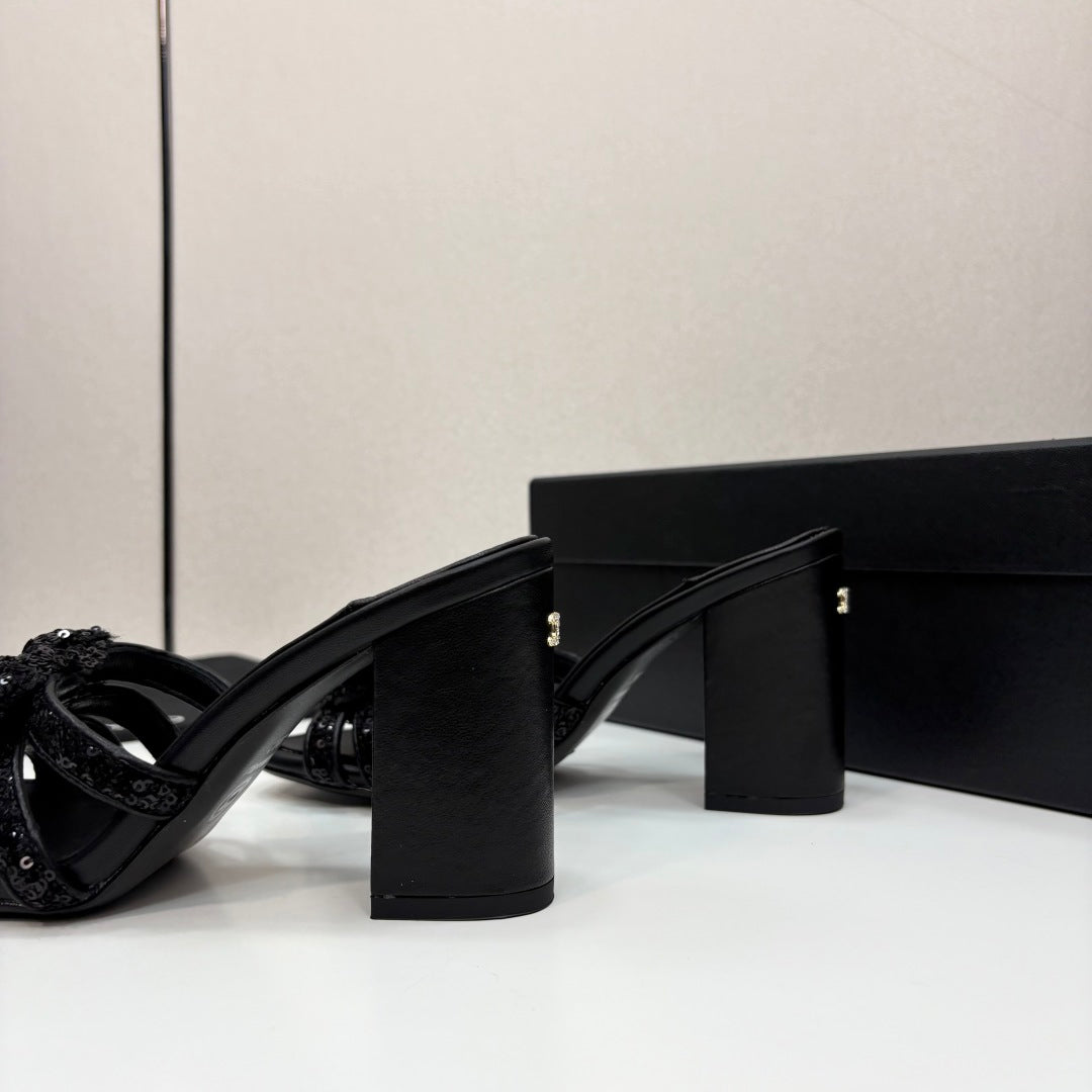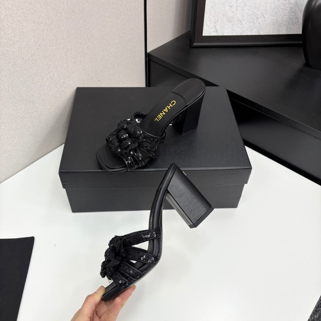 CC 25 Camellia Open Heel Mule Sandals 90mm Black Coarse Glitter Fabric And Sheepskin 368846