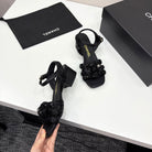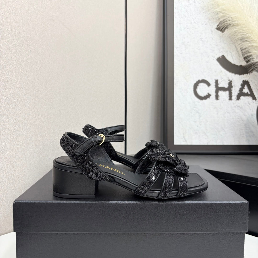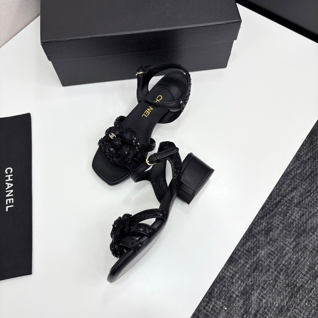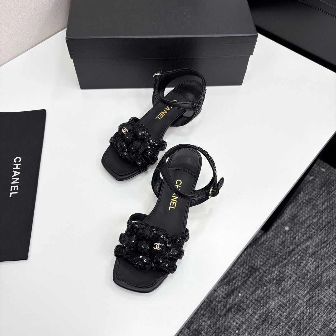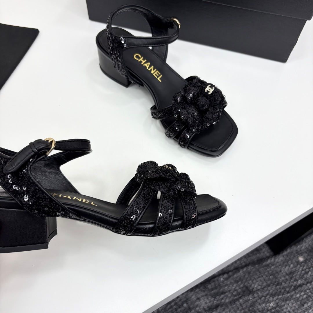 CC 25 Camellia Open Heel Sandals 50mm Black Coarse Glitter Fabric And Sheepskin 368815