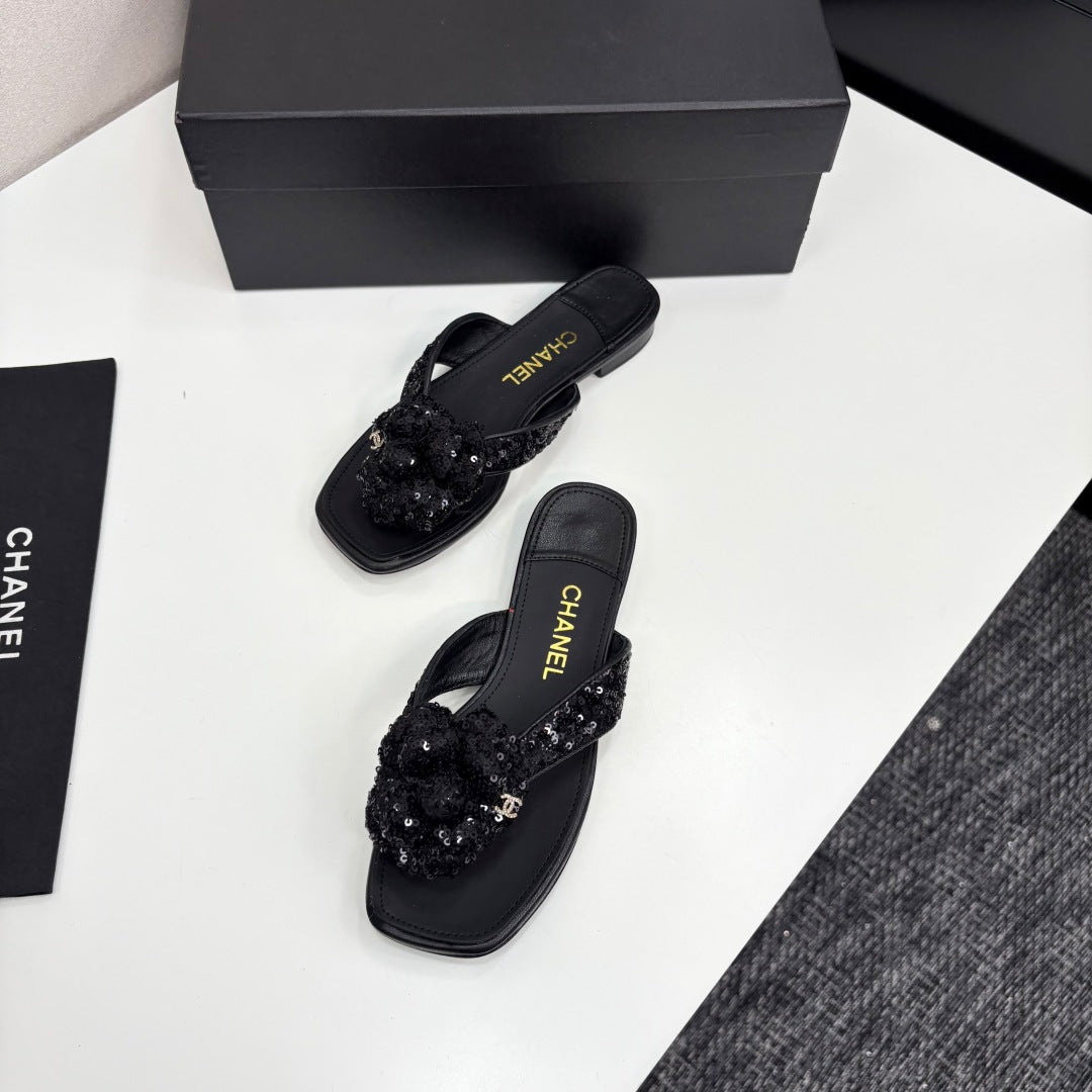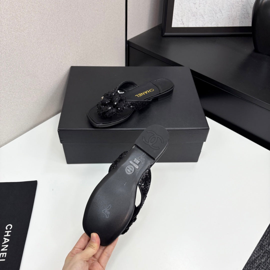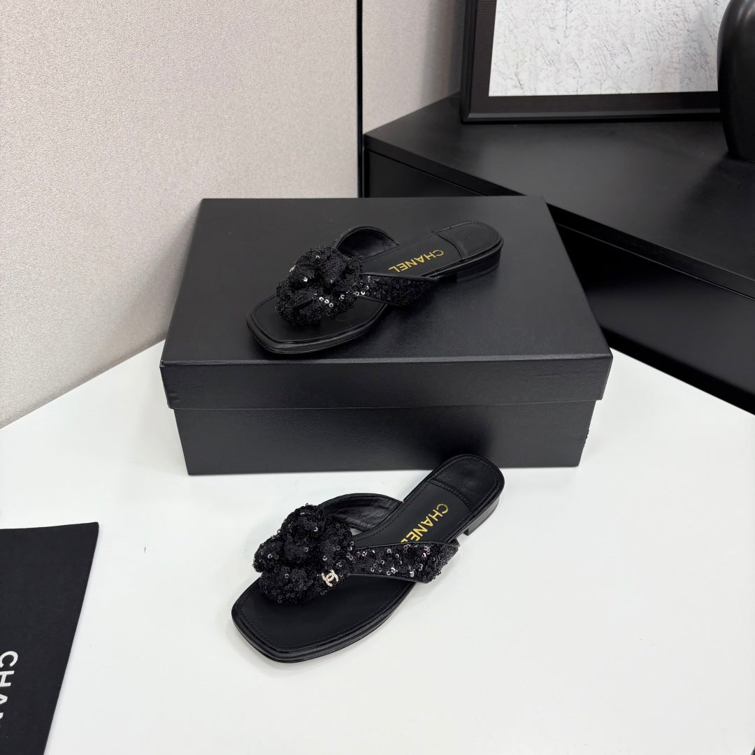 CC 25 Camellia Thong Sandals Black Coarse Glitter Fabric And Sheepskin 368835