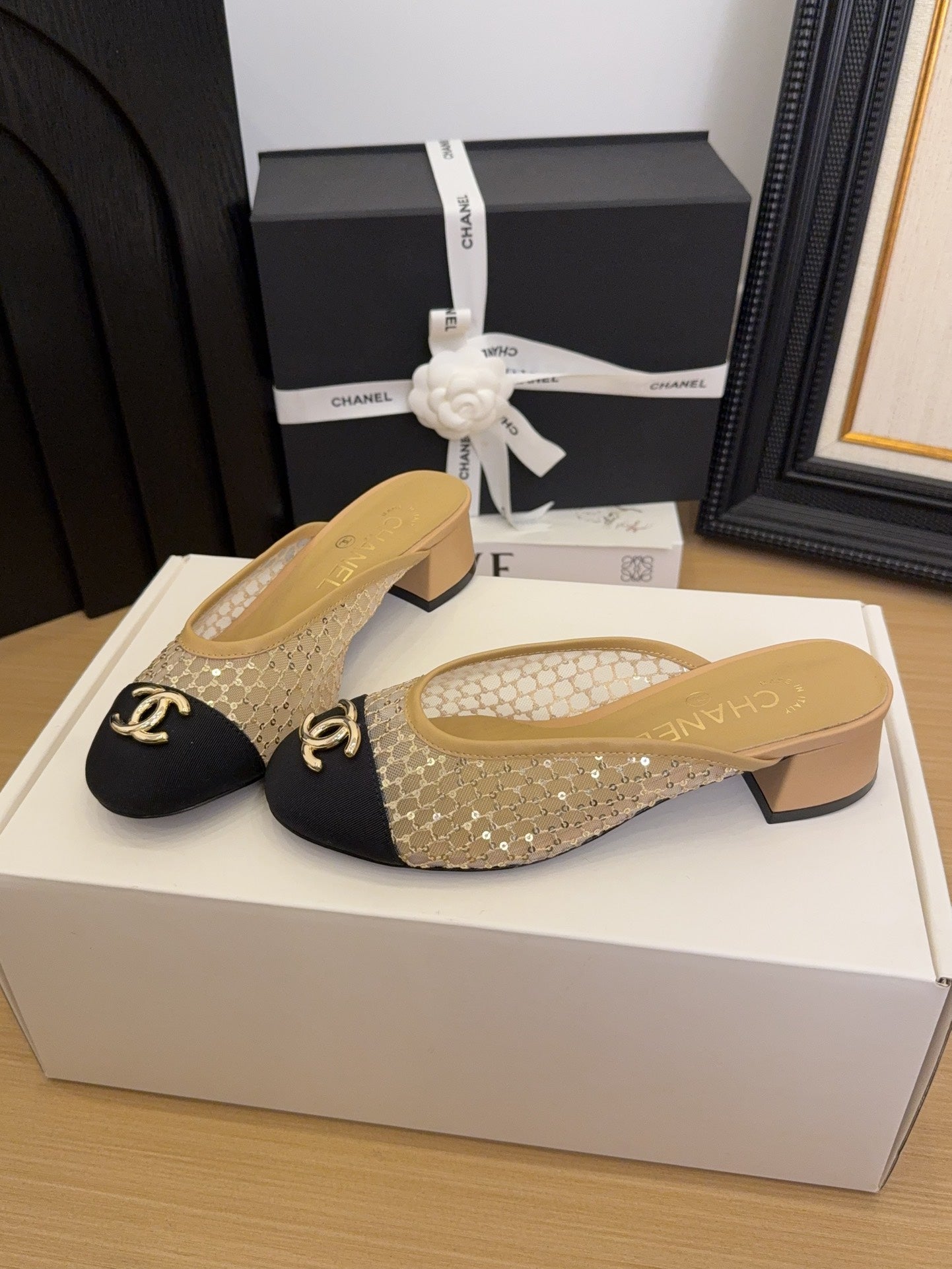 CC 25 Mule 40mm Beige Mesh Beige Sheepskin Black Grosgrain 277724