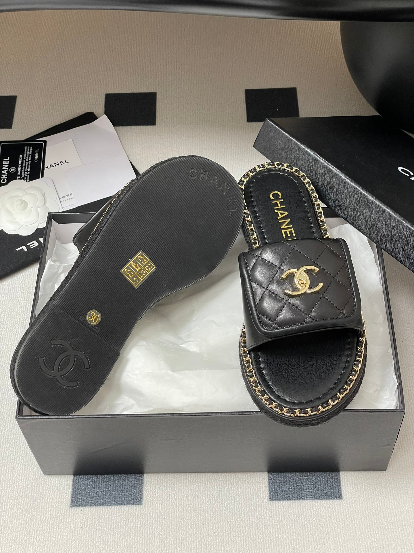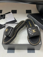CC 25S Chain Ring Edge Buckle Bag Mule Sandal Black Sheepskin 247588