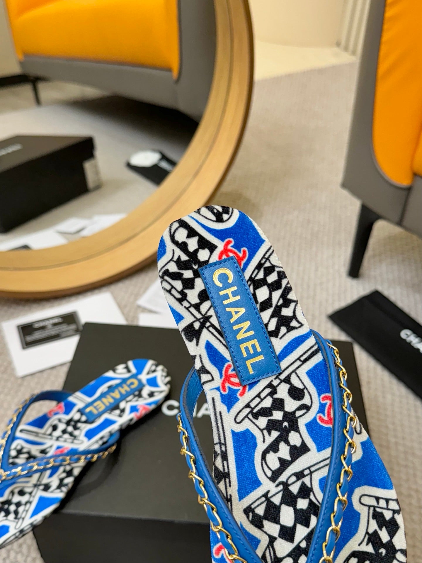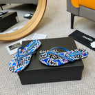 CC Chain Strap Thong Slippers Blue Cloth Sheepskin Velvet 305869