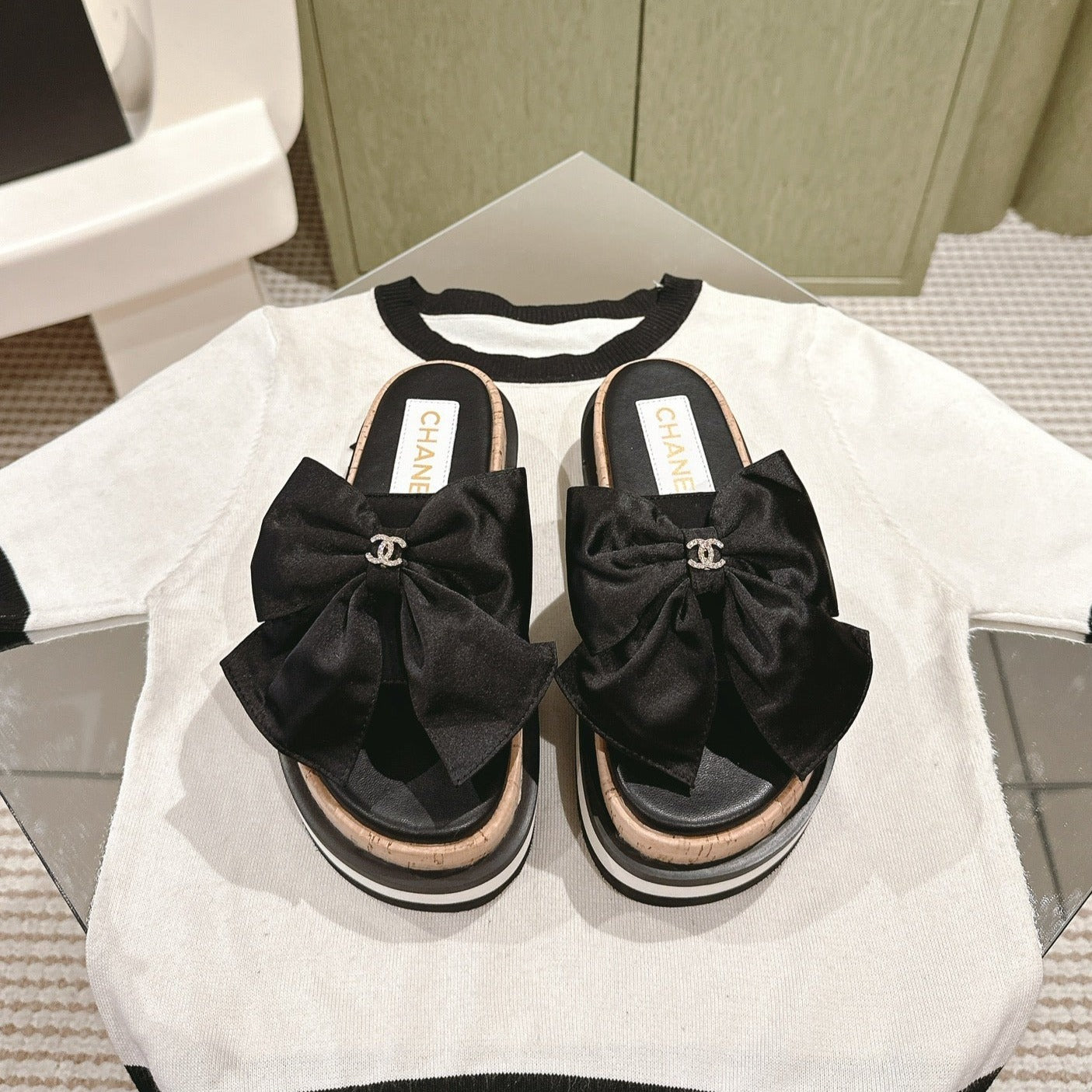 CC SLIPPERS WITH SILK BOW IN BLACK COWHIDE