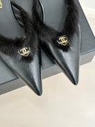 RABBIT FUR POINTED-TOE MULE IN BLACK LAMBSKIN
