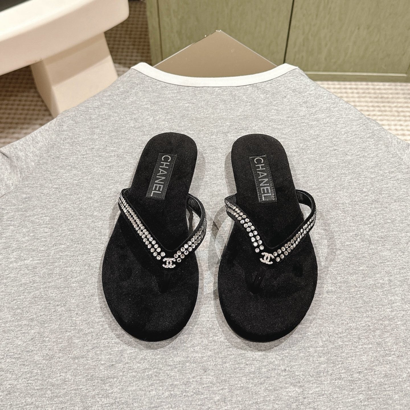 CC 25ss Rhinestone Thong Sandal Beige Velvet 461636