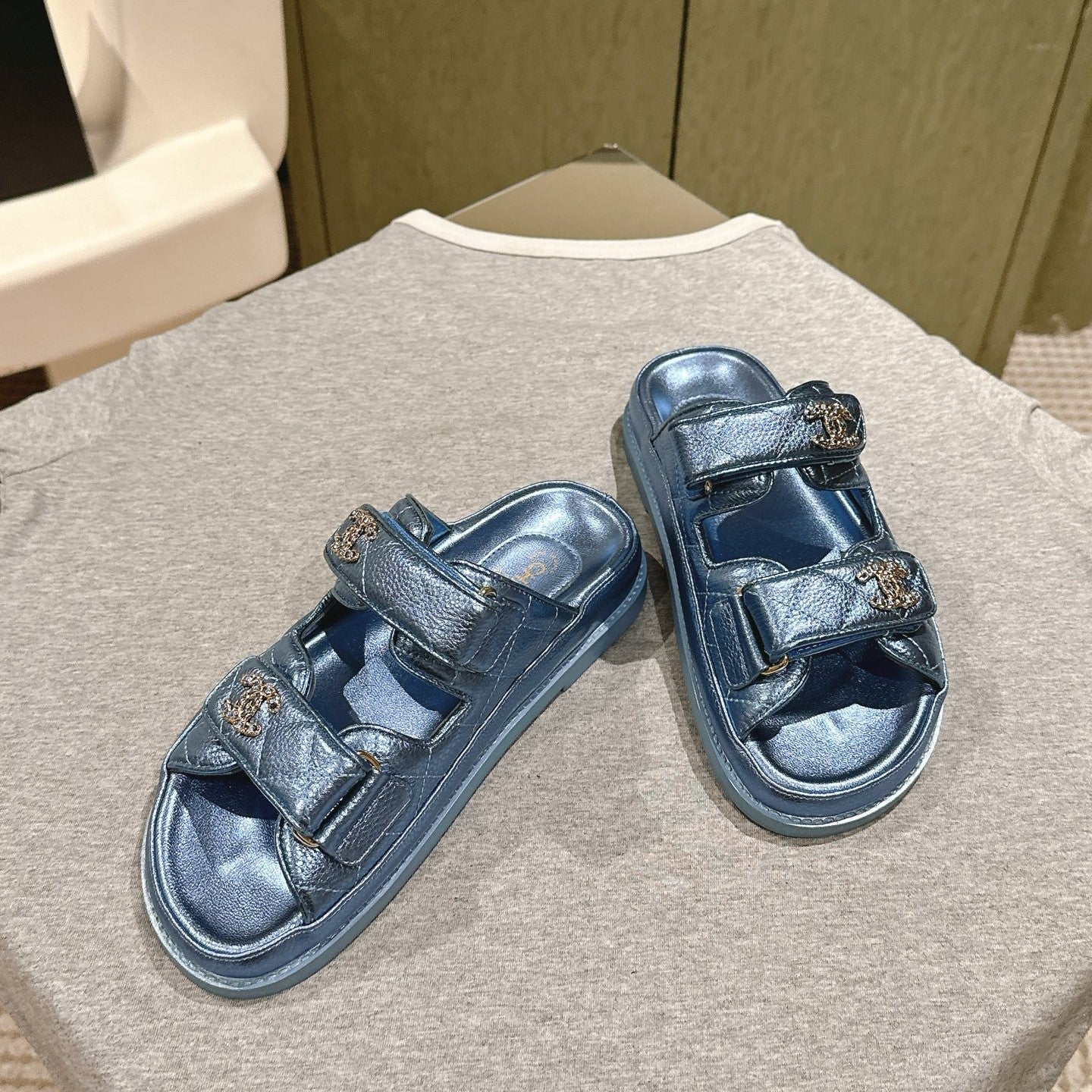 CC 25C Dad Sandals Mule Blue Metalic Grained Calfskin 462218