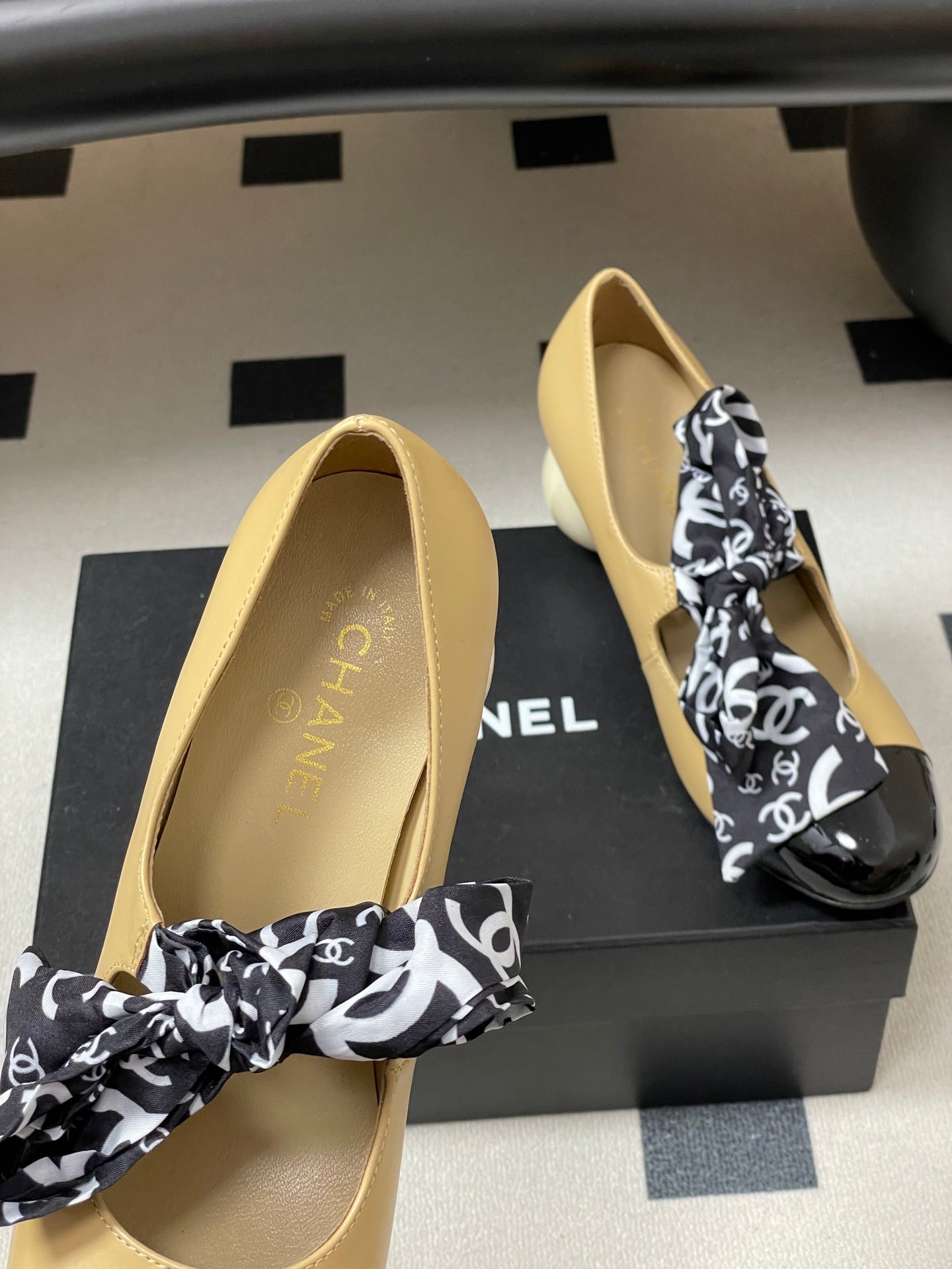 CC 26 Double C Pearl Heel Pump With Silk Ribbon Beige Sheepskin 593156