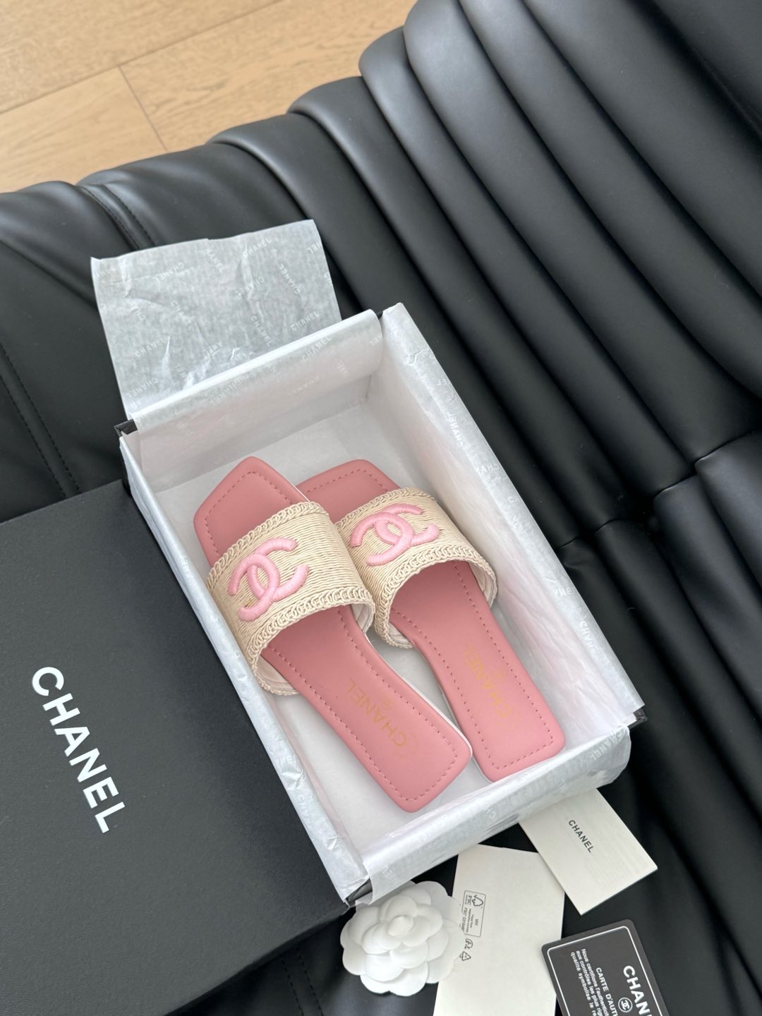 WOVEN SLIDE IN RAFFIA AND LIGHT PINK LAMBSKIN