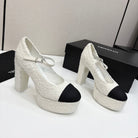 Chanel 25 Platform Thick Heel Shoe White Black Sheepskin