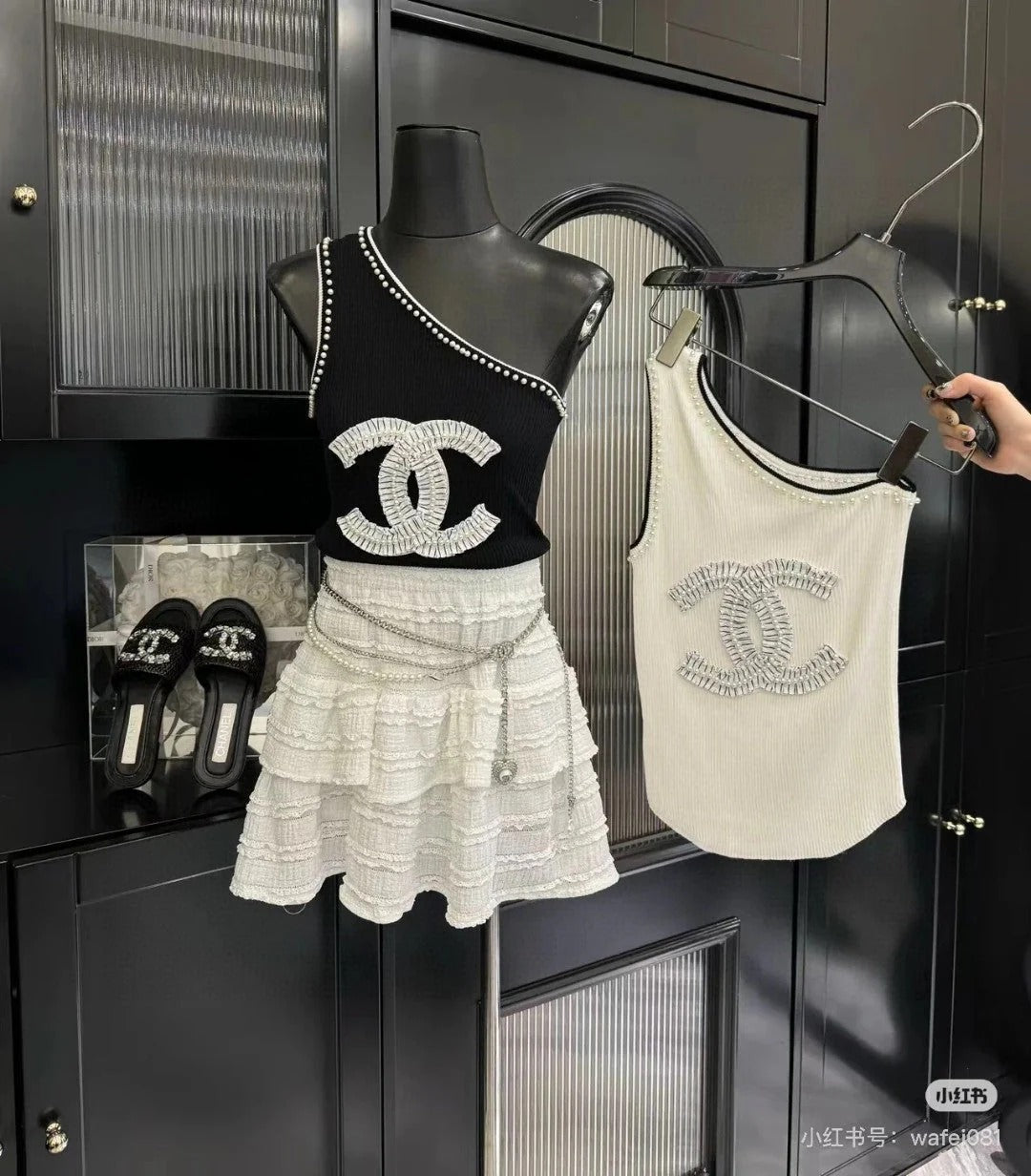 ONE SHOULDER TOP 622140 IN WHITE COTTON EMBOSSED PEARL TRIM