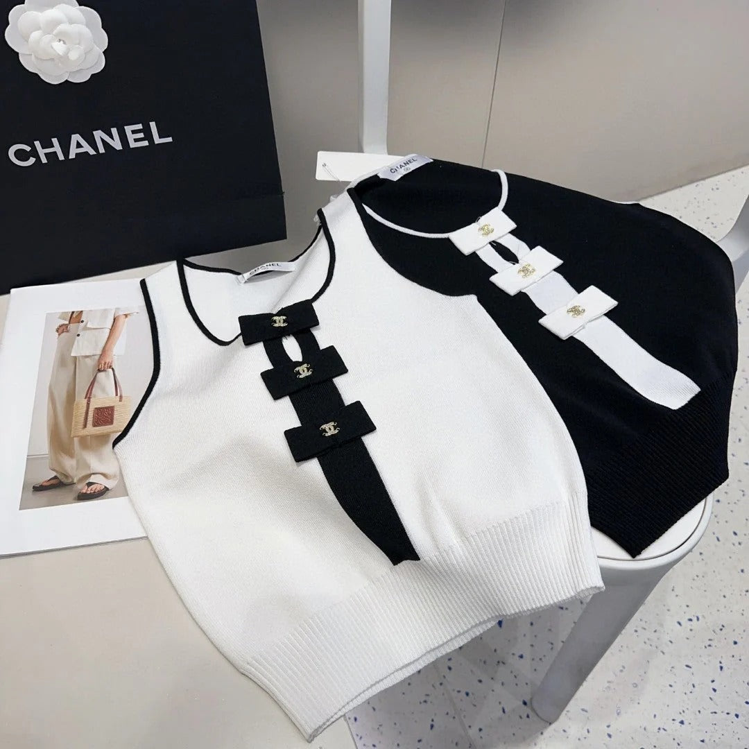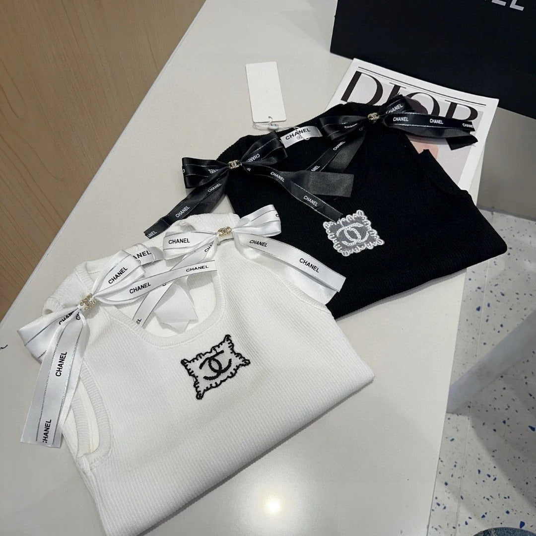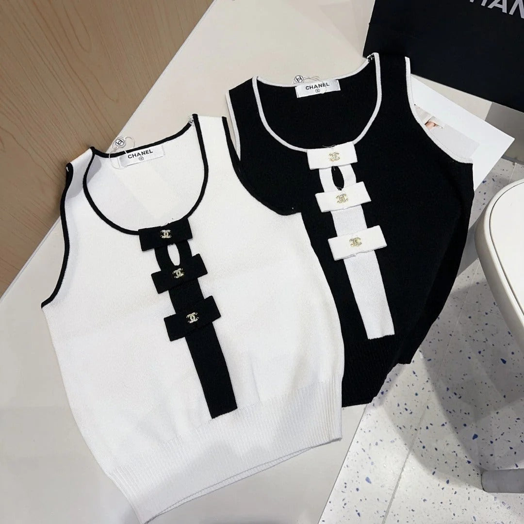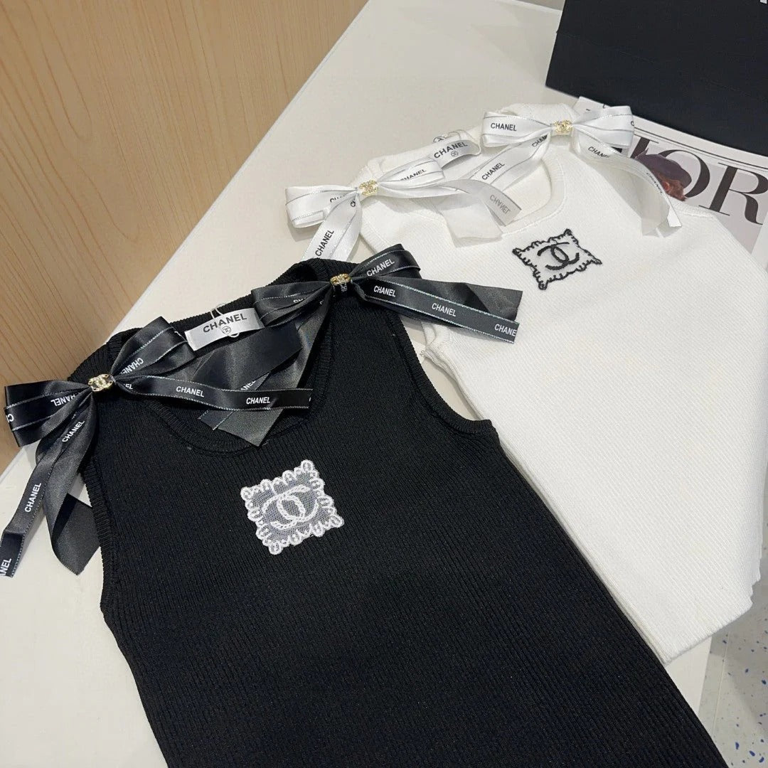 TANK TOP 610340 IN BLACK COTTON RIBBED WHITE BOW