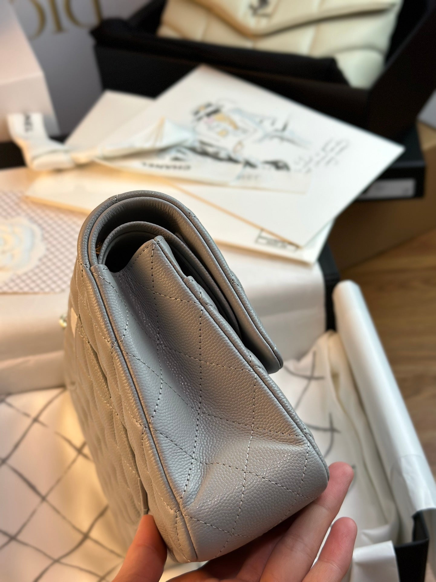 FLAP BAG 25CM GOLD HARDWARE GREY CAVIAR