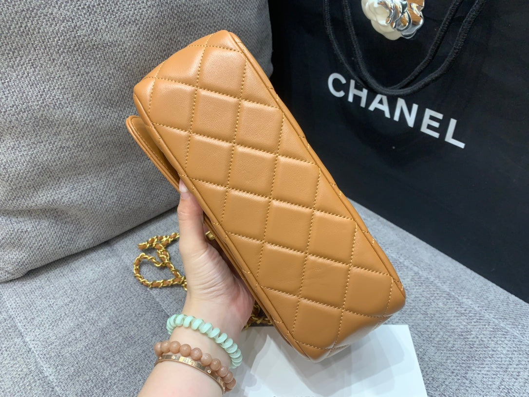 SMALL FLAP BAG 24CM TOP HANDLE BROWN LAMBSKIN GOLD HARDWARE