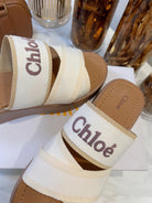 CHLOÉ WOODY WEDGE SANDALS IN WHITE CANVAS WITH CIDER BROWN RUBBER SOLE