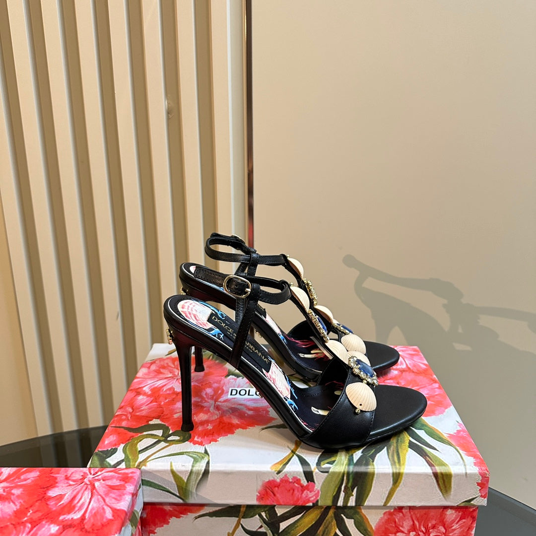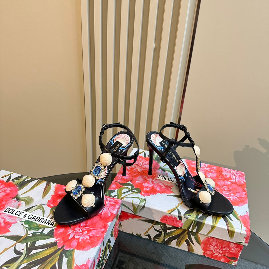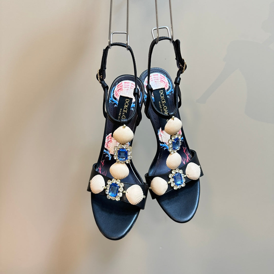 DC 24 Shell Rhinestone High Heel Sandals Black Cowhide & Sheepskin 946163
