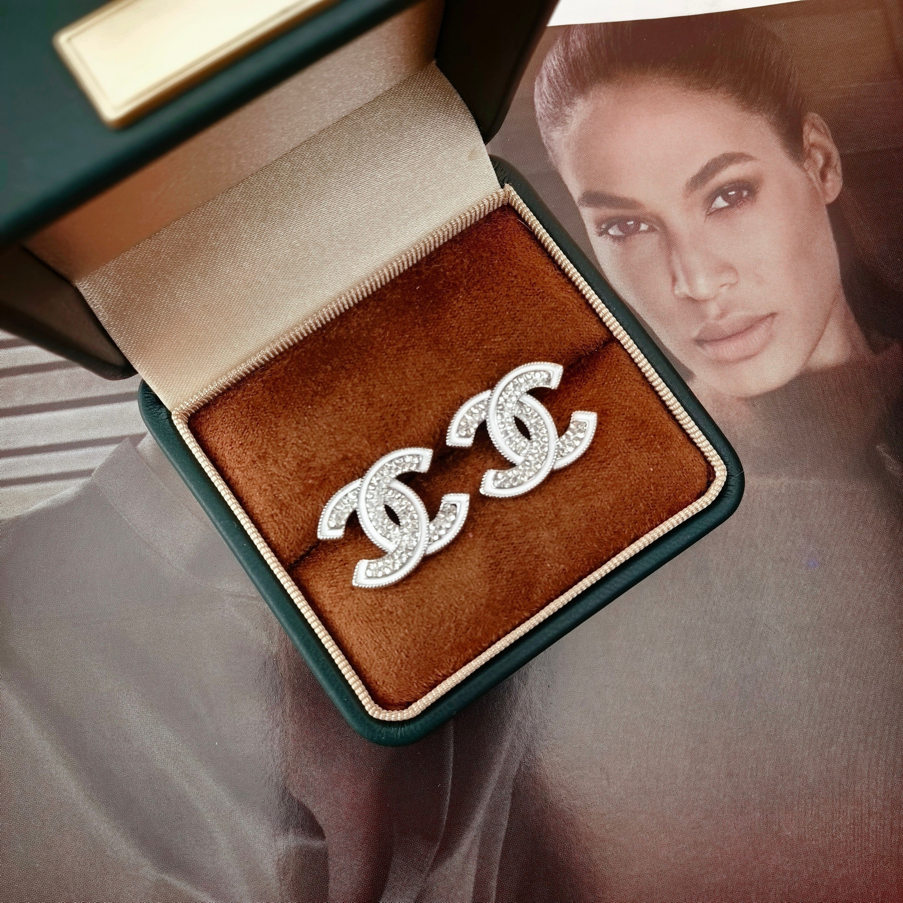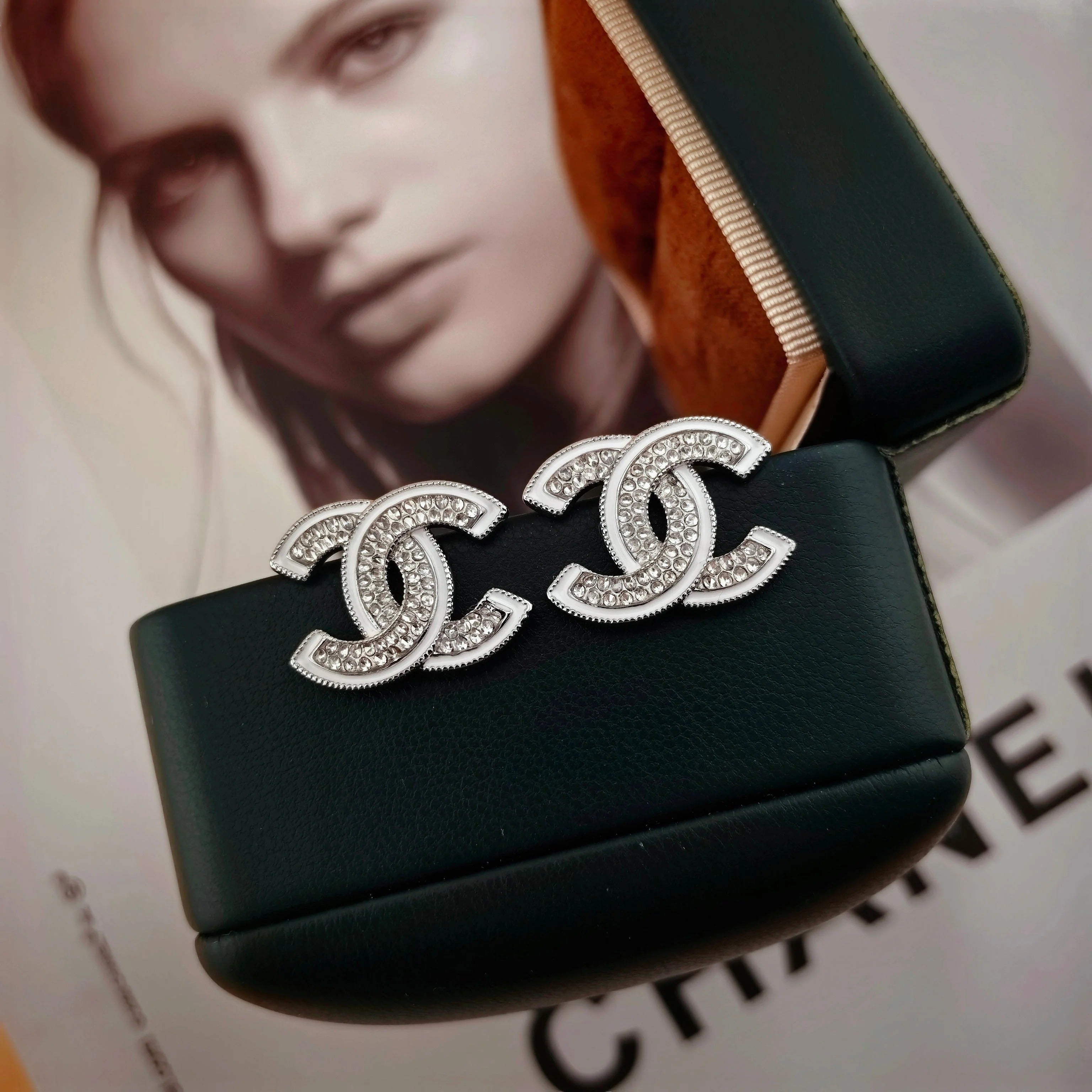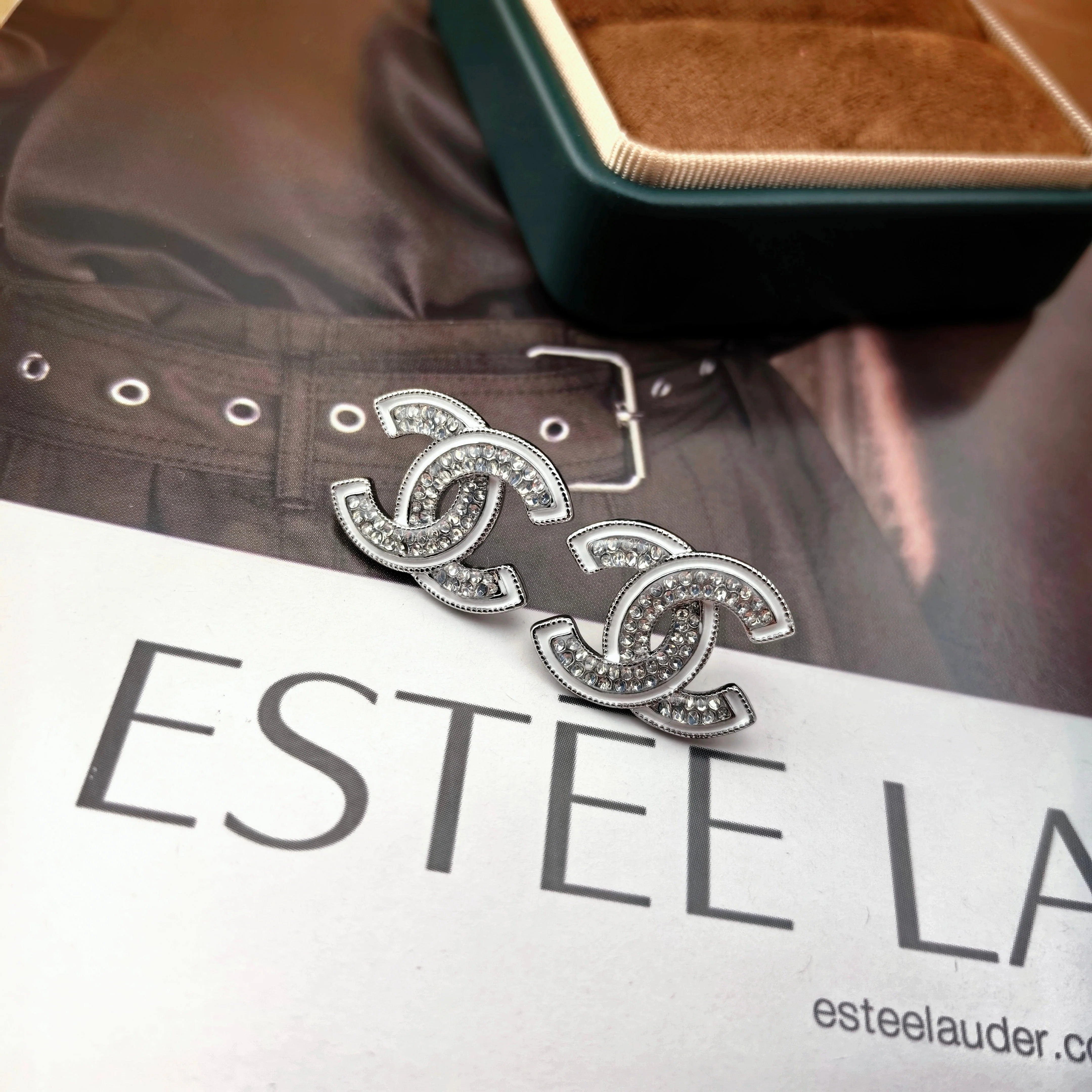 DOUBLE C STUD EARRINGS WITH WHITE TRIM AND CLEAR STONE LOGO
