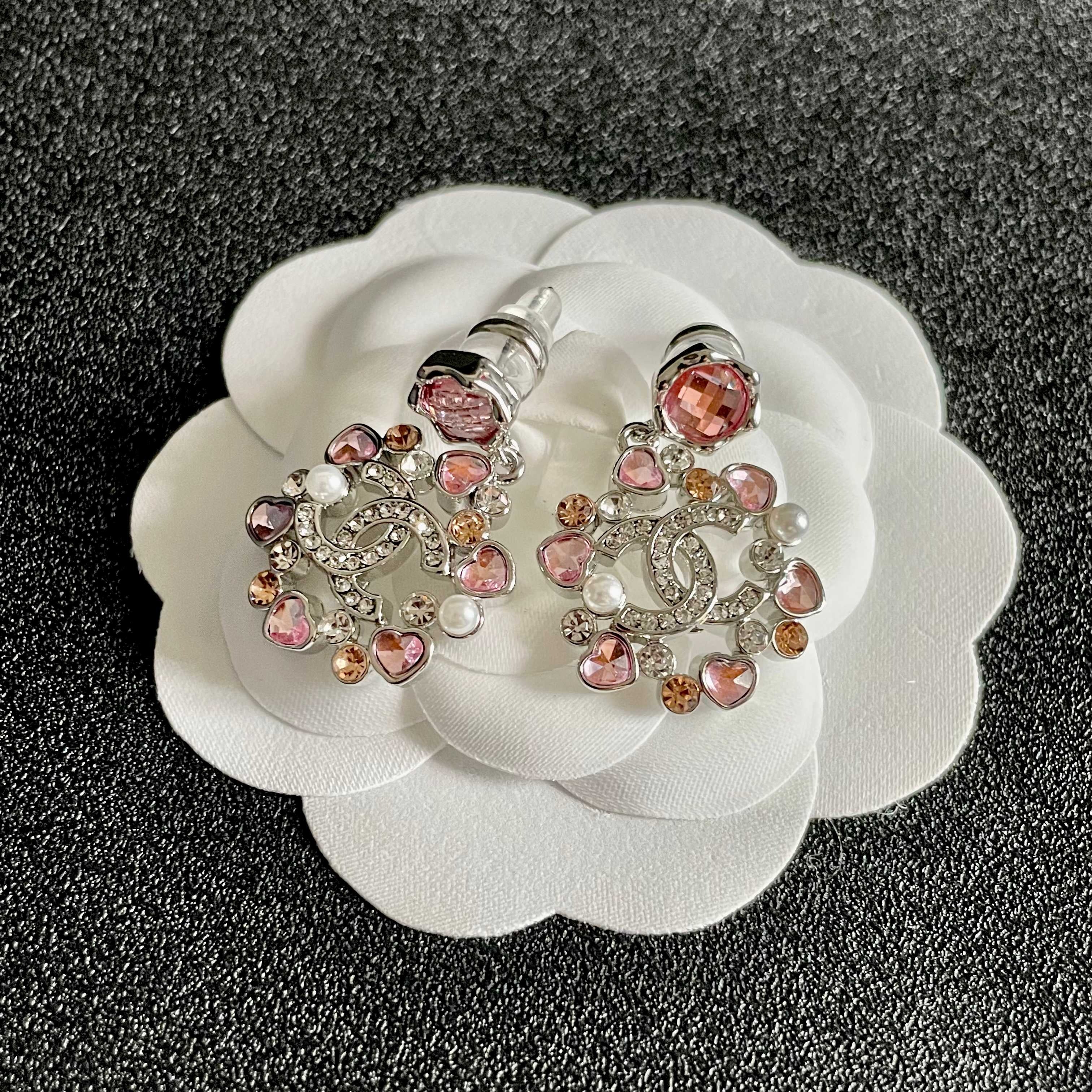 DOUBLE C STUD EARRINGS IN SILVER METAL WHITE & PINK STONES