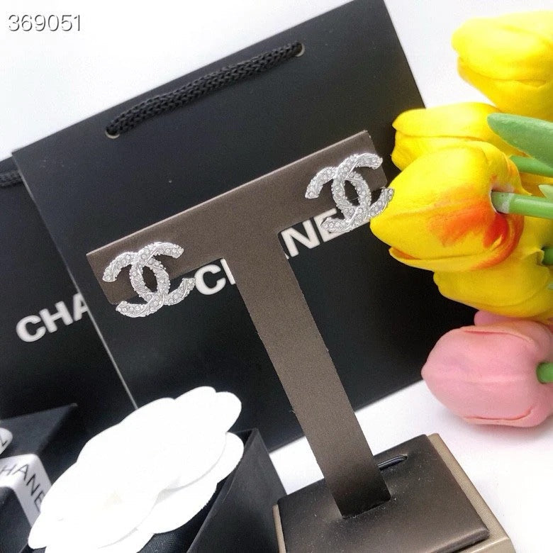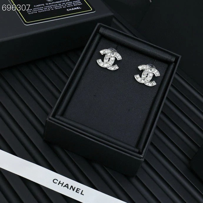 DOUBLE C STUD EARRINGS WITH WHITE TRIM AND CLEAR STONE LOGO