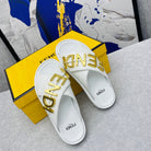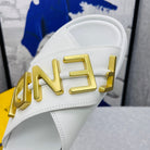 FENDI GRAPHY LOGO LETTERING SLIDES IN WHITE LAMBSKIN WITH GOLD HARDWARE